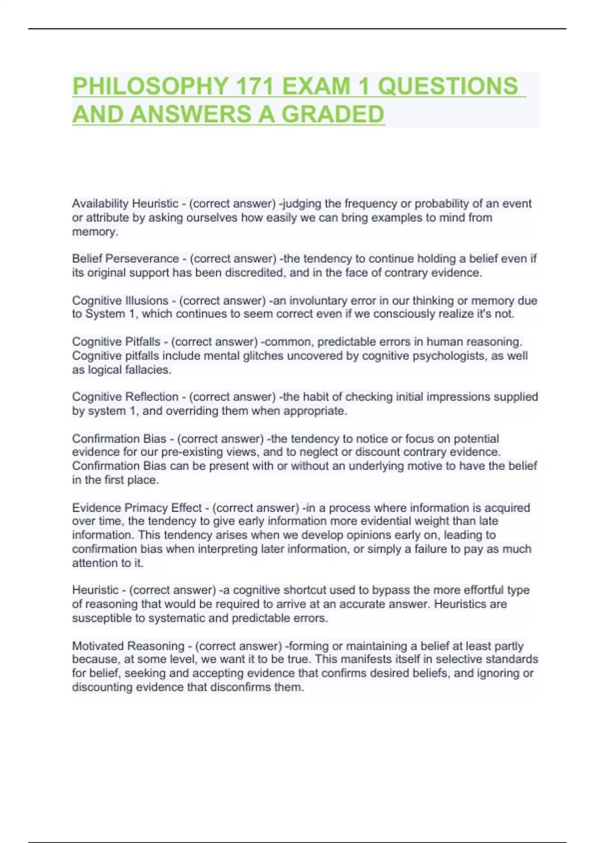PHILOSOPHY 171 EXAM 1 QUESTIONS AND ANSWERS A GRADED
