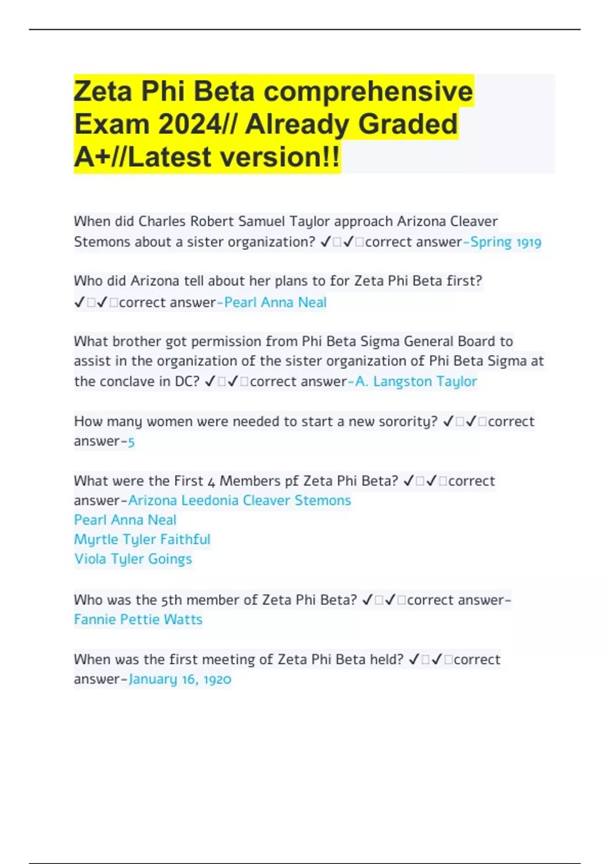 Zeta Phi Beta comprehensive Exam 2024// Already Graded A+//Latest version!! When did Charles Robert Samuel Taylor approach Arizona Cleaver Stemons about a sister organization? ️️correct answer-Spring 1919 Who did Arizona tell about her plans to for Zeta Phi Beta first? ️️correct answer-Pearl Anna Neal What brother got permission from Phi Beta Sigma General Board to assist in the organization of the sister organization of Phi Beta Sigma at the conclave in DC? ️️correct answer-A. Langston Taylor How many women were needed to start a new sorority? ️️correct answer-5 What were the First 4 Members pf Zeta Phi Beta? ️️correct answer-Arizona Leedonia Cleaver Stemons Pearl Anna Neal Myrtle Tyler Faithful Viola Tyler Goings Who was the 5th member of Zeta Phi Beta? ️️correct answerFannie Pettie Watts