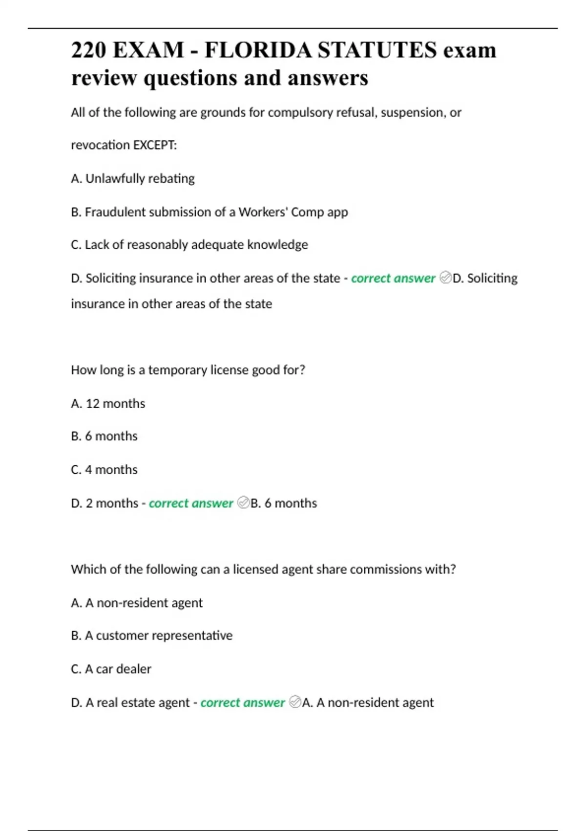 220 EXAM - FLORIDA STATUTES exam review questions and answers