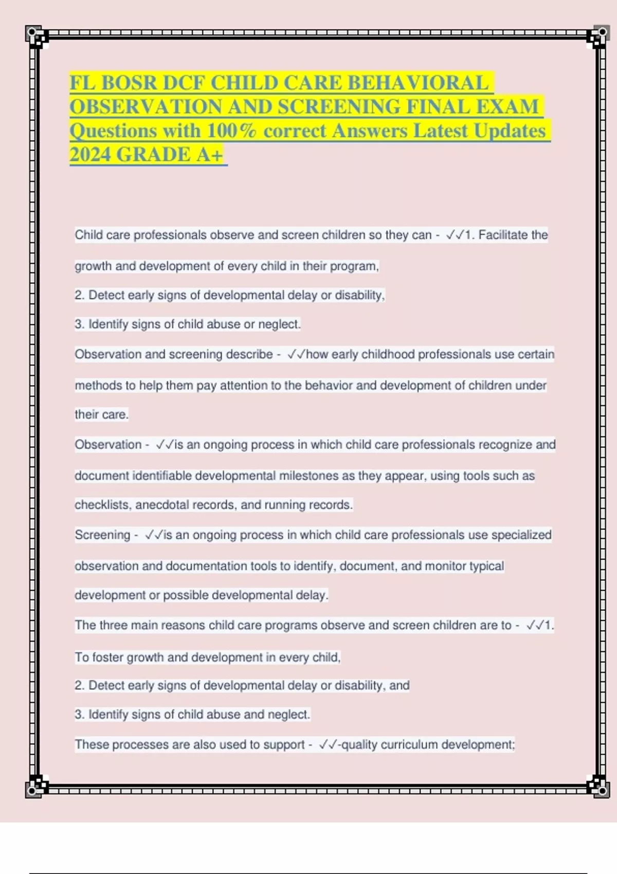 FL BOSR DCF CHILD CARE BEHAVIORAL OBSERVATION AND SCREENING FINAL EXAM Questions with 100% correct