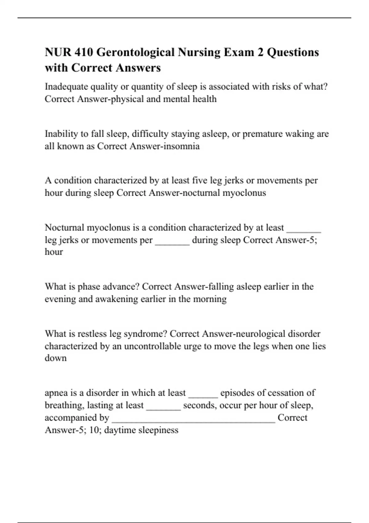 leg jerks or movements per _______ during sleep Correct Answer-5;