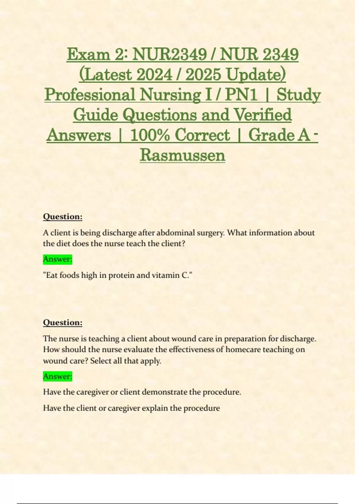 Exam 2: NUR2349 / NUR 2349 (Latest 2024 / 2025 Update) Professional Nursing I / PN1 | Study Guide Questions and Verified Answers | 100% Correct | Grade A - Rasmussen Question: A client is being discharge after abdominal surgery. What information about the diet does the nurse teach the client? Answer: "Eat foods high in protein and vitamin C." Question: The nurse is teaching a client about wound care in preparation for discharge. How should the nurse evaluate the effectiveness of homecare teaching on wound care? Select all that apply. Answer: Have the caregiver or client demonstrate the procedure. Have the client or caregiver explain the procedure Question: The provider recommends a fluid intake of at least 2 liters per day. The client reports intake over the past 24 hours is: 12 oz of coffee and 3 oz of orange juice for breakfast, 8 oz of sparkling water throughout the morning, 8 oz of tomatoes soup and 10 oz of skim milk for lunch. 1⁄4 liter of flavored water in the afternoon, 10 oz of iced tea for dinner. After calculating the 24-hour fluid intake, what does the nurse tell the client? Answer: You should drink another cup of fluid per day to meet your recommended fluid intake.