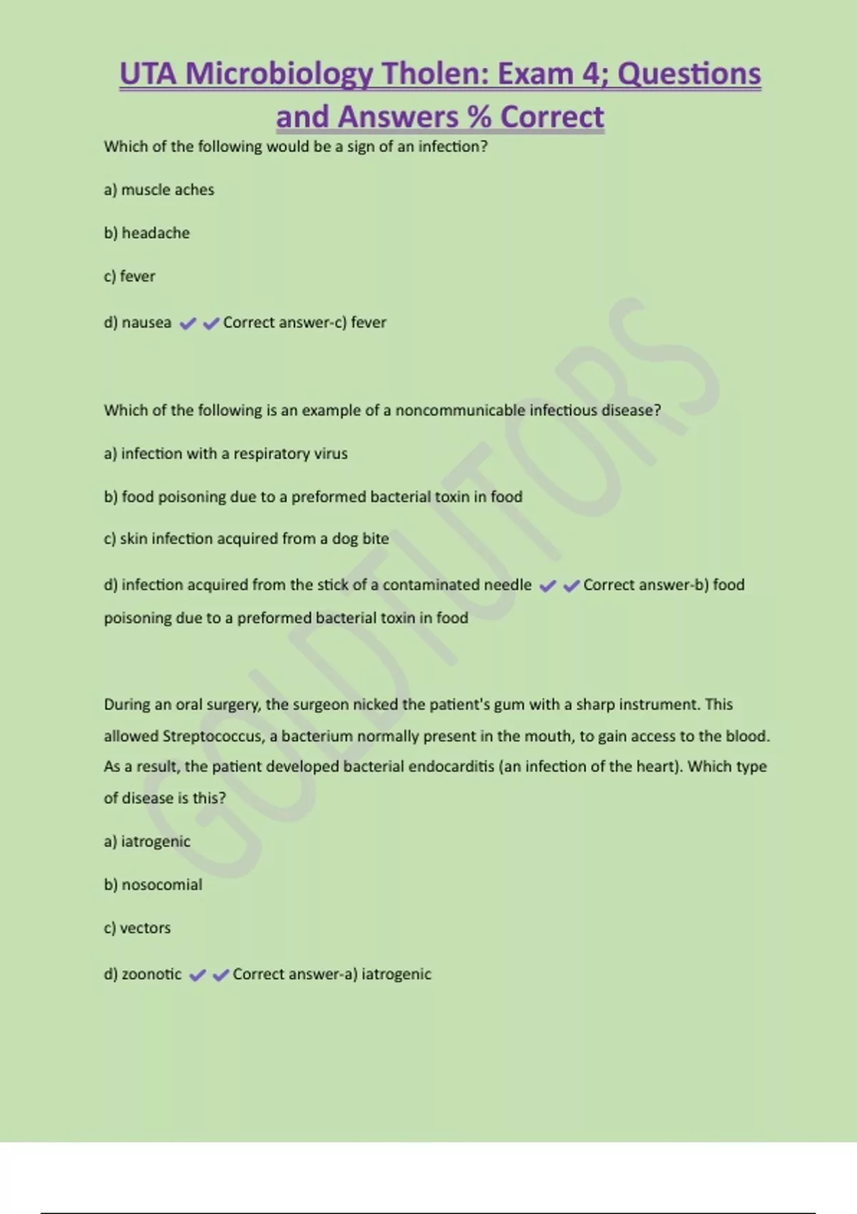 UTA Microbiology Tholen: Exam 4; Questions and Answers % Correct Which of the following would be a sign of an infection? a) muscle aches b) headache c) fever d) nausea Correct answer-c) fever Which of the following is an example of a noncommunicable infectious disease? a) infection with a respiratory virus b) food poisoning due to a preformed bacterial toxin in food c) skin infection acquired from a dog bite d) infection acquired from the stick of a contaminated needle Correct answer-b) food poisoning due to a preformed bacterial toxin in food