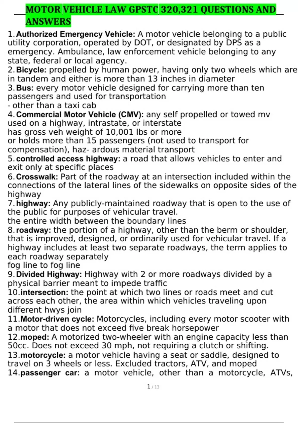 MOTOR VEHICLE LAW GPSTC 320,321 QUESTIONS AND ANSWERS 1. Authorized Emergency Vehicle: A motor vehicle belonging to a public utility corporation, operated by DOT, or designated by DPS as a emergency. Ambulance, law enforcement vehicle belonging to any state, federal or local agency. 2. Bicycle: propelled by human power, having only two wheels which are in tandem and either is more than 13 inches in diameter 3. Bus: every motor vehicle designed for carrying more than ten passengers and used for transportation - other than a taxi cab 4. Commercial Motor Vehicle (CMV): any self propelled or towed mv used on a highway, intrastate, or interstate has gross veh weight of 10,001 lbs or more or holds more than 15 passengers (not used to transport for compensation), haz- ardous material transport