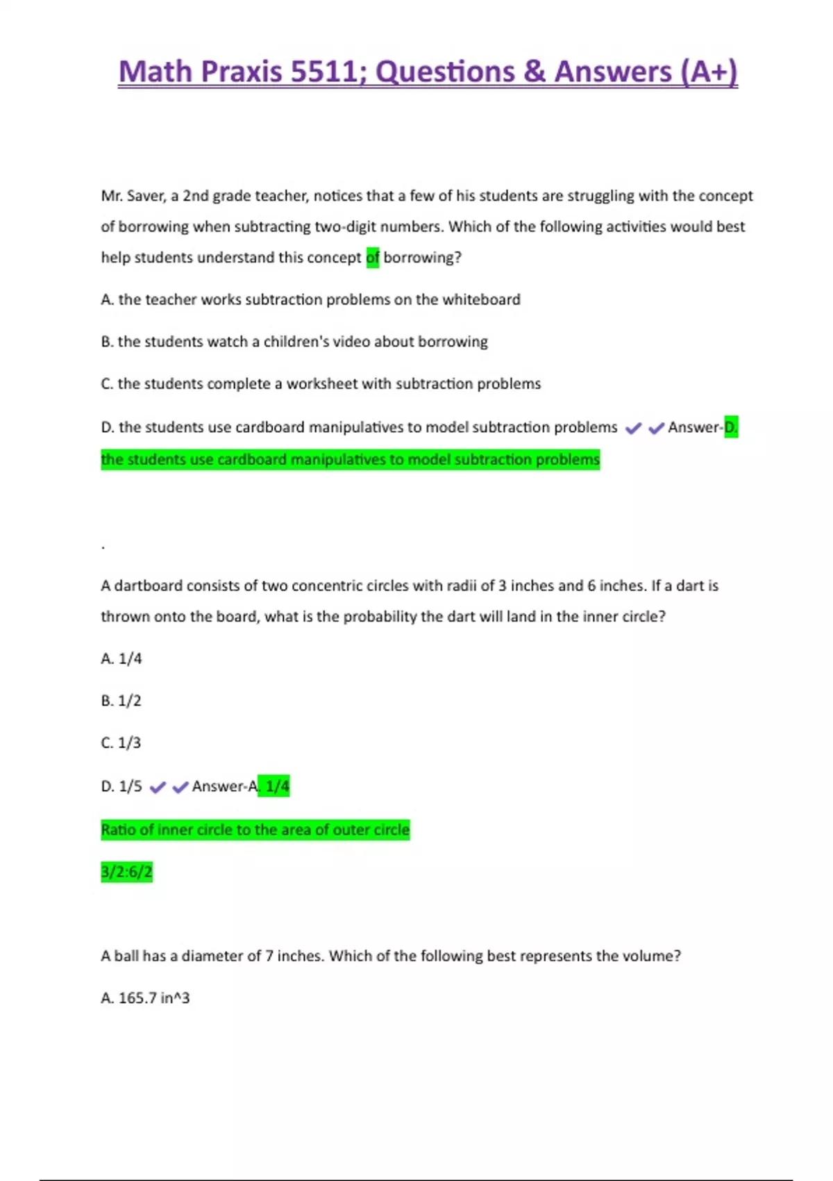 Math Praxis 5511; Questions & Answers (A+) Mr. Saver, a 2nd grade teacher, notices that a few of his students are struggling with the concept of borrowing when subtracting two-digit numbers. Which of the following activities would best help students understand this concept of borrowing? A. the teacher works subtraction problems on the whiteboard B. the students watch a children's video about borrowing C. the students complete a worksheet with subtraction problems D. the students use cardboard manipulatives to model subtraction problems Answer-D. the students use cardboard manipulatives to model subtraction problems