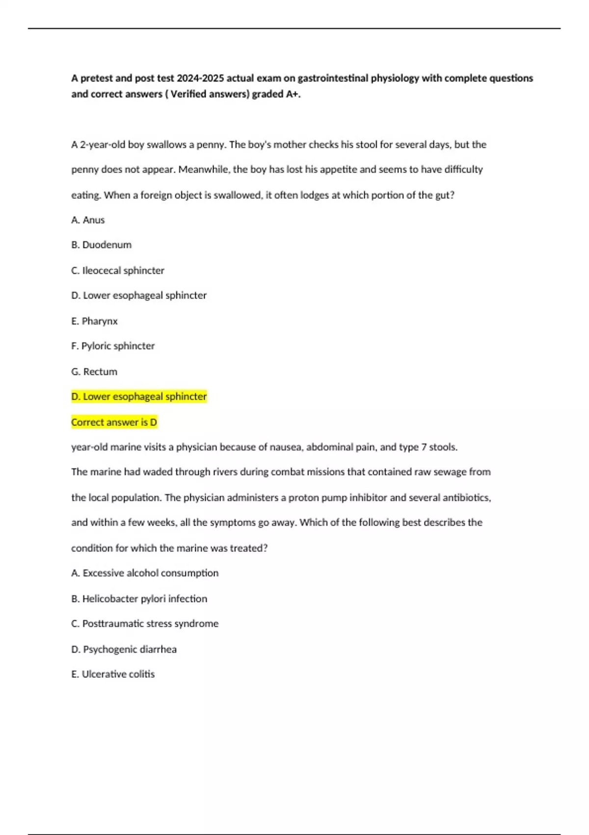 A pretest and post test 2024-2025 actual exam on gastrointestinal physiology with complete questions