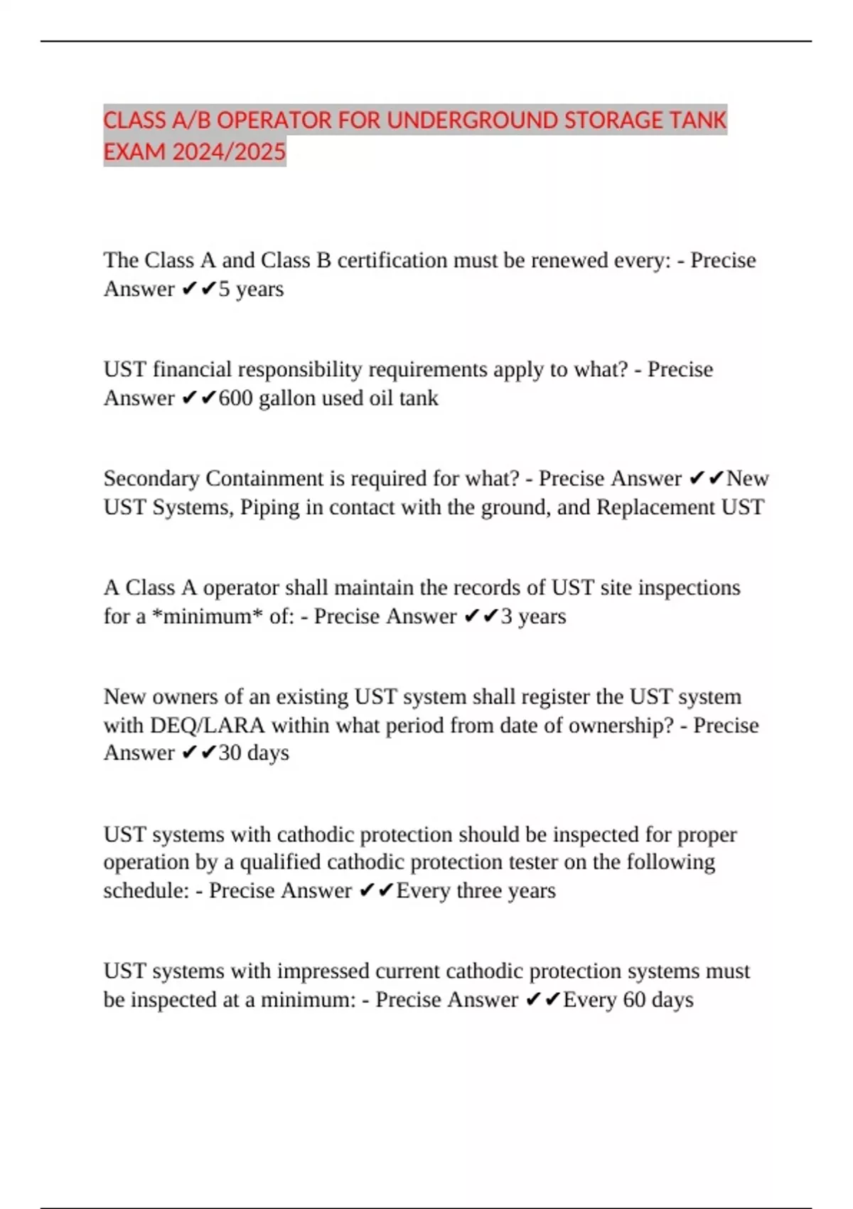 CLASS A/B OPERATOR FOR UNDERGROUND STORAGE TANK EXAM 2024/2025 The Class A and Class B certification must be renewed every: - Precise Answer 5 years UST financial responsibility requirements apply to what? - Precise Answer 600 gallon used oil tank Secondary Containment is required for what? - Precise Answer New UST Systems, Piping in contact with the ground, and Replacement UST A Class A operator shall maintain the records of UST site inspections for a *minimum* of: - Precise Answer 3 years New owners of an existing UST system shall register the UST system with DEQ/LARA within what period from date of ownership? - Precise Answer 30 days UST systems with cathodic protection should be inspected for proper operation by a qualified cathodic protection tester on the following schedule: - Precise Answer Every three years Expert Test Prep: Get access to comprehensive study guides, practice exams, and tips from top educators to boost your test scores. Assignment Assistance: Struggling with assignments? Our experts are here to help you understand and complete your homework on time. Project Support: From brainstorming to final presentation, our team provides step-by-step guidance to make your projects shine. 24/7 Availability: Study at your own pace with resources available round the clock. Affordable Pricing: Quality education support without breaking the bank.