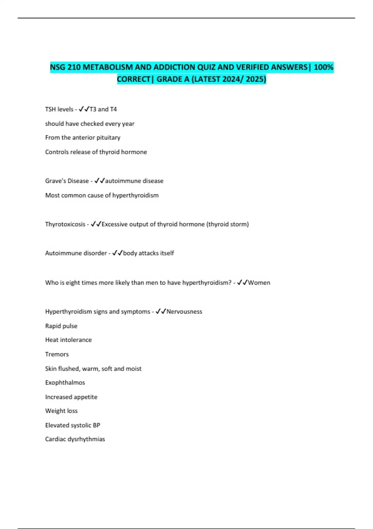 NSG 210 METABOLISM AND ADDICTION QUIZ AND VERIFIED ANSWERS| 100%