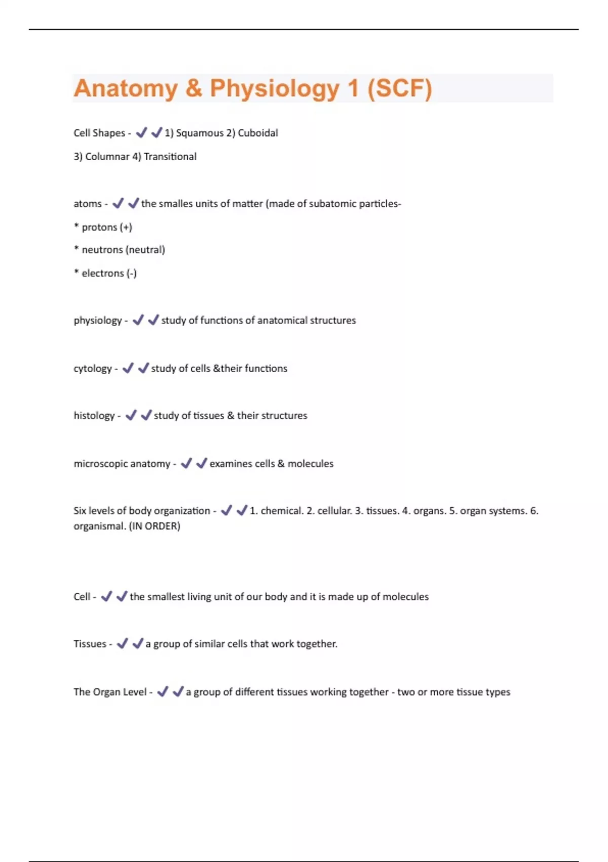 Cell Shapes - 1) Squamous 2) Cuboidal 3) Columnar 4) Transitional atoms - the smalles units of matter (made of subatomic particles- * protons (+) * neutrons (neutral) * electrons (-) physiology - study of functions of anatomical structures cytology - study of cells &their functions histology - study of tissues & their structures microscopic anatomy - examines cells & molecules Six levels of body organization - 1. chemical. 2. cellular. 3. tissues. 4. organs. 5. organ systems. 6. organismal. (IN ORDER) Cell - the smallest living unit of our body and it is made up of molecules Tissues - a group of similar cells that work together. The Organ Level - a group of different tissues working together - two or more tissue typesThe organism level - one living entity = an organism Integumentary System - MAJOR ORGANS: skin, hair, nails, sweat glands FUNCTION: protects, regulates body temp, sensory info Skeletal System - MAJOR ORGANS: Bones, cartilages, assoc. ligaments, bone marrow FUNCTIONS: support & protection 4 other tissues Stores calcium & other minerals, form blood cells Muscular System - ORGANS: skeletal muscles & assoc tendons FUNCTIONS: movement, protection & support for other tissues, generate heat to maintain body temp Nervous System - ORGANS: Brain, Spinal Cord, Peripheral Nerves, Sense organs FUNCTIONS: Directs response to stimuli, moderates activities of other organ systems, provides & interprets sensory info (CONTROL CENTER FOR WHOLE BODY) Homeostasis - Balanced range - a stable internal environment Autoregulation (intrinsic) - Automatic response in a cell, tissue or organ to some environmental change anatomy - describes structures of body...what they are made of & where located Extrinsic Regulation - Responses controlled by nervous & endocrine systems Control of Homeostasis (3 components) - 1) Receptor - monitors the environment & responds to stimuli 2) Control Center - analyzes info & determines appropriate response 3) Effector - tissues/organs taht receive commands from the control center & carry it out.Negative Feedback - 99% of the time (opposite direction) response opposes or eliminates the original stimulus. Most common. Positive Feedback - The response enhances or exaggerates the original : blood clotting & contractions in child birth Metabolism - All the chemical processes that occur in the body Anabolism - to build up other chemicals (simple answer) -synthesis of new molecules w/i the body's cells & tissues Catabolism - to break down of molecules w/i the body Intracellular fluid - Inside of cell Extracellular fluid - Outside of cell Matter - anything that occupies space & has mass elements - made up of identical atoms Trace elements - present in small quantities but are very important for normal functioning Which element makes up most of our body? - Oxygen - ~65% What kind of charge do atoms have? - Atoms are electrically neutral ION - an atom with a charge (positive or negative) (gain or lose an e-)ISOTOPES - Atoms of an element with a different number of neutrons (# of protons remains same) MOLECULES - Formed when atoms share electrons (2 or more atoms hooked together) held by chemical bonds. ELECTRONS - * occupy shells * innermost shell holds up to 2 electons * All other shells like to have at least 8 electrons (octet rule) How do atoms obtain stability - * share electrons with another * give up electrons to another atom * Take on electrons from another atom IONIC BOND - - involves transfer of 1 or more electrons between atoms - resulting ions are highly attracted to one another - attraction provides the force behind the bond COVALENT BOND - Atoms share one or more valence electrons * Equal sharing = nonpolar covalent bond * Unequal sharing=polar covalent bond due to differences in electronegativity ex. (water)HYDROGEN BOND - * Hydrogen atoms with a partial positive charge attract neighboring atoms with a partial negative charge * A weak bond, but highly impt for temporary links between molecules Do we want stable or unstable atoms in our bodies? - Unstable Energy - The capacity to do work Energy can neither be created NOR destroyed Chemical Energy - A form of potential energy stored in chemical bonds which can be converted to kinetic energy INORGANIC COMPOUNDS - Do NOT contain carbon (exceptions: CO2, HCO3-) and have simple structures. INCLUDES: Water, Salts, Acids, Bases WATER IN CHEMICAL REACTIONS - Many of the chemical reactions in our body occur in water. Water is useful to dissolve BOTH organic & inorganic polar substances * A high heat capacity - can absorb & store a lot of heat w/o heating up too much itself * a high heat of vaporization which helps the body to maintain a constant body temp. * Reduces friction between 2 surfaces - Serous membranes - Mucus HYDROPHILIC - Water loving - substances w/polar covalent bonds
