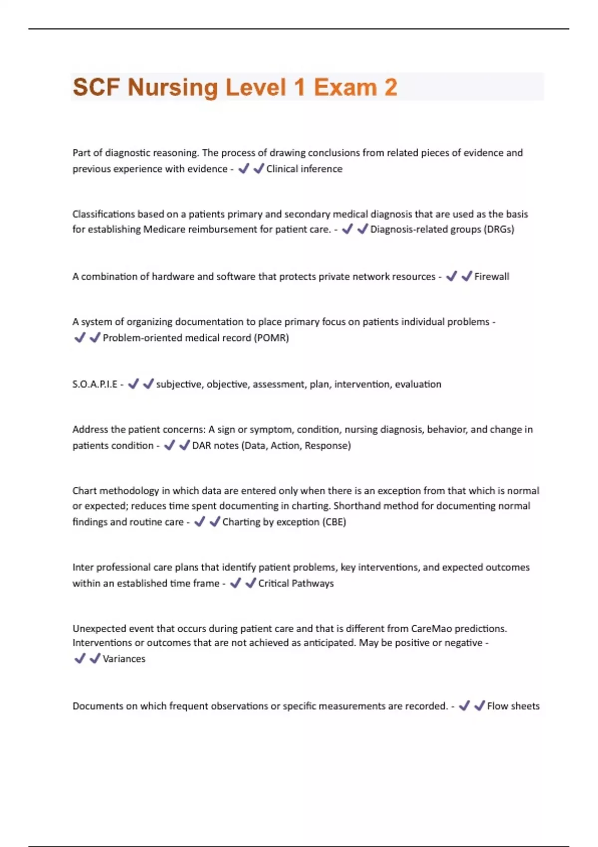 Part of diagnostic reasoning. The process of drawing conclusions from related pieces of evidence and previous experience with evidence - Clinical inference Classifications based on a patients primary and secondary medical diagnosis that are used as the basis for establishing Medicare reimbursement for patient care. - Diagnosis-related groups (DRGs) A combination of hardware and software that protects private network resources - Firewall A system of organizing documentation to place primary focus on patients individual problems - Problem-oriented medical record (POMR) S.O.A.P.I.E - subjective, objective, assessment, plan, intervention, evaluation Address the patient concerns: A sign or symptom, condition, nursing diagnosis, behavior, and change in patients condition - DAR notes (Data, Action, Response) Chart methodology in which data are entered only when there is an exception from that which is normal or expected; reduces time spent documenting in charting. Shorthand method for documenting normal findings and routine care - Charting by exception (CBE) Inter professional care plans that identify patient problems, key interventions, and expected outcomes within an established time frame - Critical Pathways Unexpected event that occurs during patient care and that is different from CareMao predictions. Interventions or outcomes that are not achieved as anticipated. May be positive or negative - Variances Documents on which frequent observations or specific measurements are recorded. - Flow sheetsWritten care plans used for groups of patients who have similar health care problems. - Standardized care plans or Clinical practice guidelines Mechanism by which entries describing patient care activities are made over a 24 hour period. The activities are then translated into a rating score that allows for comparison of patients who vary by severity of illness - Acuity recording Comprehensive computerized system used by all healthcare practitioners to permanently store information pertaining to a patients health status, clinical problems, and functional abilities - Computer-based patient record A confidential document that describes any patient accident while the person is on the premises of a health care agency. - incident report management and processing of information, generally with the assistance of computers - Information technology (IT) the application of computer and information science in all basic and biomedical sciences to facilitate the acquisition, processing, interpretation, optimal use, and communication of health related data - Health informatics Use of information and computer technology to support all aspects of nursing practice, including direct delivery of care, administration, education, and research. - Nursing informatics A computer based system that collects, stores, and manipulates, data to allow health care providers to make informed decisions about patient care. - Clinical information system A system that incorporates the principles of nursing informatics to support the work that nurses do by facilitating documentation of nursing process activities and offering resources for managing nursing care delivery. Allows the nurse to share the care plan immediately with the patient. Can check on Laboratory results. - Nursing Clinical Information system (NCIS)Purpose of the medical record - Communication Reimbursement Research Legal documentation Education Auditing/monitoring Documentation needs to conform to the standards of - National Committee for Quality Assurance (NCQA) and the Joint Commission Nursing action that produces a written account of pertinent patient data, clinical decisions and interventions, and patients response in a health record. - Documentation all clinical summaries must include - - Description of clients physical, mental, and emotional status -Resolved health problems -Treatment that needs to be continued -Current medications