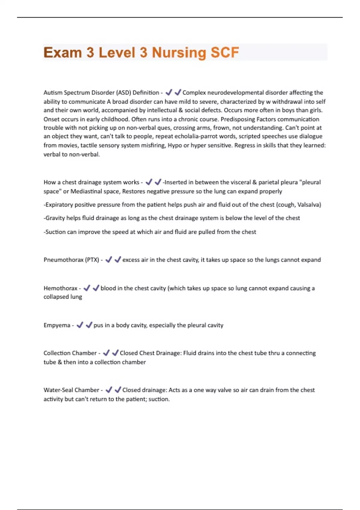Autism Spectrum Disorder (ASD) Definition - Complex neurodevelopmental disorder affecting the ability to communicate A broad disorder can have mild to severe, characterized by w withdrawal into self and their own world, accompanied by intellectual & social defects. Occurs more often in boys than girls. Onset occurs in early childhood. Often runs into a chronic course. Predisposing Factors communication trouble with not picking up on non-verbal ques, crossing arms, frown, not understanding. Can't point at an object they want, can't talk to people, repeat echolalia-parrot words, scripted speeches use dialogue from movies, tactile sensory system misfiring, Hypo or hyper sensitive. Regress in skills that they learned: verbal to non-verbal. How a chest drainage system works - -Inserted in between the visceral & parietal pleura "pleural space" or Mediastinal space, Restores negative pressure so the lung can expand properly -Expiratory positive pressure from the patient helps push air and fluid out of the chest (cough, Valsalva) -Gravity helps fluid drainage as long as the chest drainage system is below the level of the chest -Suction can improve the speed at which air and fluid are pulled from the chest Pneumothorax (PTX) - excess air in the chest cavity, it takes up space so the lungs cannot expand Hemothorax - blood in the chest cavity (which takes up space so lung cannot expand causing a collapsed lung Empyema - pus in a body cavity, especially the pleural cavity Collection Chamber - Closed Chest Drainage: Fluid drains into the chest tube thru a connecting tube & then into a collection chamber Water-Seal Chamber - Closed drainage: Acts as a one way valve so air can drain from the chest activity but can't return to the patient; suction.Tidaling - Normal Finding: Fluctuations in the water seal chamber fluid level that correspond w/respirations, only with tall water column, adjusts w/Patient's respirations, Stops if lung is fully reexpanded or system obstructed. Note: w/chest tube, water should rise with inspiration & fall with expiration but visa versa if on a ventilator Bubbling In Water Seal Chamber - In the bottom of the water seal chamber indicates an air leak (caused most often by poor tubing connections, Air leaks: could be patient chest tube insertion site, loose connection, Check if patient is in distress Control Regulator - water filled or dry suction removes chest drainage & maintains flow Pleural Space - Normally has about 20 mL of fluid for lubrication, & -20 cm of negative pressure Traditional Water Seal a/k/a Wet Suction - It has 3 chambers; a collection chamber, water seal chamber, & a wet suction control chamber, requires sterile fluid instilled into water seal & suction chambers. It has positive & negative pressure release valves, you will have intermittent bubbling this indicates proper functioning. Additional suctioning can be added by connecting to a suction source Dry Suction Water Seal - Common in hospitals, 3 chambers, a collection chamber, water seal chamber (middle chamber) & suction regulator dial. Requires sterile fluid instilled in water seal chamber at 2-cm level, no fluid filled suction chamber. Suction pressure is set w/an orange regulator dial. Has Positive & Negative pressure release valves, Has an indicator to signify that the suction pressure is adequate, Quieter than traditional water seal systems Dry Suction Also referred to as a one-way valve system - Has a one way mechanical valve that allows air to leave the chest & prevents air from moving back into the chest wall. No need to fill suction chamber w/fluid, thus can be set up quickly in an emergency, draining air from thoracic cavity. Not good for fluid drainage (hemothorax). Works even if knocked over, making it ideal for ambulatory pt's. Negative Pressure - In the water seal column indicates negative pressure in the pleural space, the goal of chest tube therapy. The whole reason a pt has a chest cavity is to Restore negative pressure, so pt can breathe Chest Tube Assessment - Vital Signs, Pulse Ox, Lung sounds for good expansion, assess for air leak, assess tubing & connections, assess for tidaling, chest tube insertion site & you want to know what # ison the tube at the insertion site, dressing, fluid levels in water seal chamber, Atrium Box below level of chest, Monitor output, color, amt of drainage, mark box w/amount of drainage, assess for pain, check for subcutaneous emphysema-feels like Rice Krispies air under the skin, Adults drainage s/b about 70 mL/hr. if more than 100 mL/hr. Children: >5mL/1 hr. or >3 mL/3 hrs. If order states drain w/gravity no suction will be applied. Unclamp port on the top of the device. Encourage pt to cough, deep breathe, this aides in lung expansion & facilitates drainage The mnemonic DOPE is used for - The water seal chamber on the chest tube system has a constant bubbling not associated with respirations this could be a sign of a pneumothorax or other problems: Dislodgement, Obstruction, Pneumothorax, & Equipment Failure. A normal air leak will coincide with the patient's exhale or w/a good cough Chest Tube Emergency Supplies to have in room w/Pt at all times - 2 clamps w/out teeth for each chest tube placed, Vaseline gauze or 4x4's & tape per facility, Sterile water, suture removal kit. Continuous Bubbling on Chest Tube - Cross Clamp to locate source of air leak, start at insertion site clam right next to patient, if bubbling then the leak is at insertion site. If not continue until the bubbling stops. Do not leave clamped can cause tension Pneumothorax less than one minute max. Do not strip or milk tubing, can increase negative pressure & damage lungs, if drainage unit cracked replace unit Chest Tube Emergencies - Chest tube & drainage system disconnected. This means the water seal is broken & atmospheric air is rushing into chest causing the lung to collapse. Have Sterile water handy put open end of chest tube into the bottle of sterile water ASAP to resume water