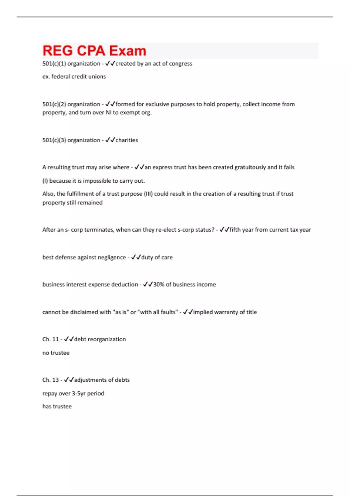 501(c)(1) organization - created by an act of congress ex. federal credit unions 501(c)(2) organization - formed for exclusive purposes to hold property, collect income from property, and turn over NI to exempt org. 501(c)(3) organization - charities A resulting trust may arise where - an express trust has been created gratuitously and it fails (I) because it is impossible to carry out. Also, the fulfillment of a trust purpose (III) could result in the creation of a resulting trust if trust property still remained After an s- corp terminates, when can they re-elect s-corp status? - fifth year from current tax year best defense against negligence - duty of care business interest expense deduction - 30% of business income cannot be disclaimed with "as is" or "with all faults" - implied warranty of title Ch. 11 - debt reorganization no trustee Ch. 13 - adjustments of debts repay over 3-5yr period has trusteeCh. 7 - provides liquidation of debtors estate pays off creditors to extent of proceeds trustee Ch. 7 entity - dissolved Ch. 7 individual - debts discharged
