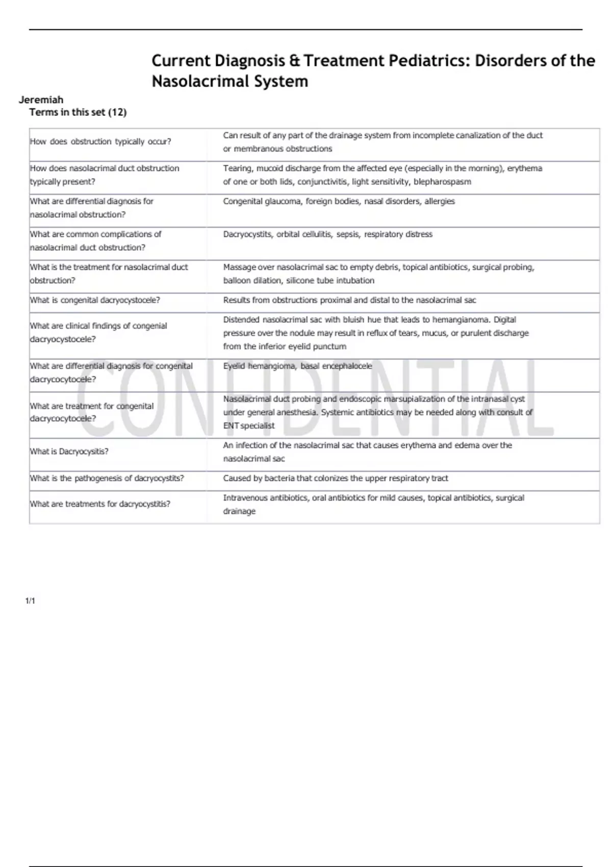 Current Diagnosis & Treatment Pediatrics: Disorders of the Nasolacrimal System Terms in this set (12) How does obstruction typically occur? Can result of any part of the drainage system from incomplete canalization of the duct or membranous obstructions How does nasolacrimal duct obstruction typically present? Tearing, mucoid discharge from the affected eye (especially in the morning), erythema of one or both lids, conjunctivitis, light sensitivity, blepharospasm What are differential diagnosis for nasolacrimal obstruction? Congenital glaucoma, foreign bodies, nasal disorders, allergies What are common complications of nasolacrimal duct obstruction? Dacryocystits, orbital cellulitis, sepsis, respiratory distress What is the treatment for nasolacrimal duct obstruction? Massage over nasolacrimal sac to empty debris, topical antibiotics, surgical probing, balloon dilation, silicone tube intubation What is congenital dacryocystocele? Results from obstructions proximal and distal to the nasolacrimal sac What are clinical findings of congenial dacryocystocele? Distended nasolacrimal sac with bluish hue that leads to hemangianoma. Digital pressure over the nodule may result in reflux of tears, mucus, or purulent discharge from the inferior eyelid punctum What are differential diagnosis for congenital dacrycocytocele? Eyelid hemangioma, basal encephalocele What are treatment for congenital dacrycocytocele? Nasolacrimal duct probing and endoscopic marsupialization of the intranasal cyst under general anesthesia. Systemic antibiotics may be needed along with consult of ENT specialist What is Dacryocysitis? An infection of the nasolacrimal sac that causes erythema and edema over the nasolacrimal sac What is the pathogenesis of dacryocystits? Caused by bacteria that colonizes the upper respiratory tract What are treatments for dacryocystitis? Intravenous antibiotics, oral antibiotics for mild causes, topical antibiotics, surgical drainage 1/1