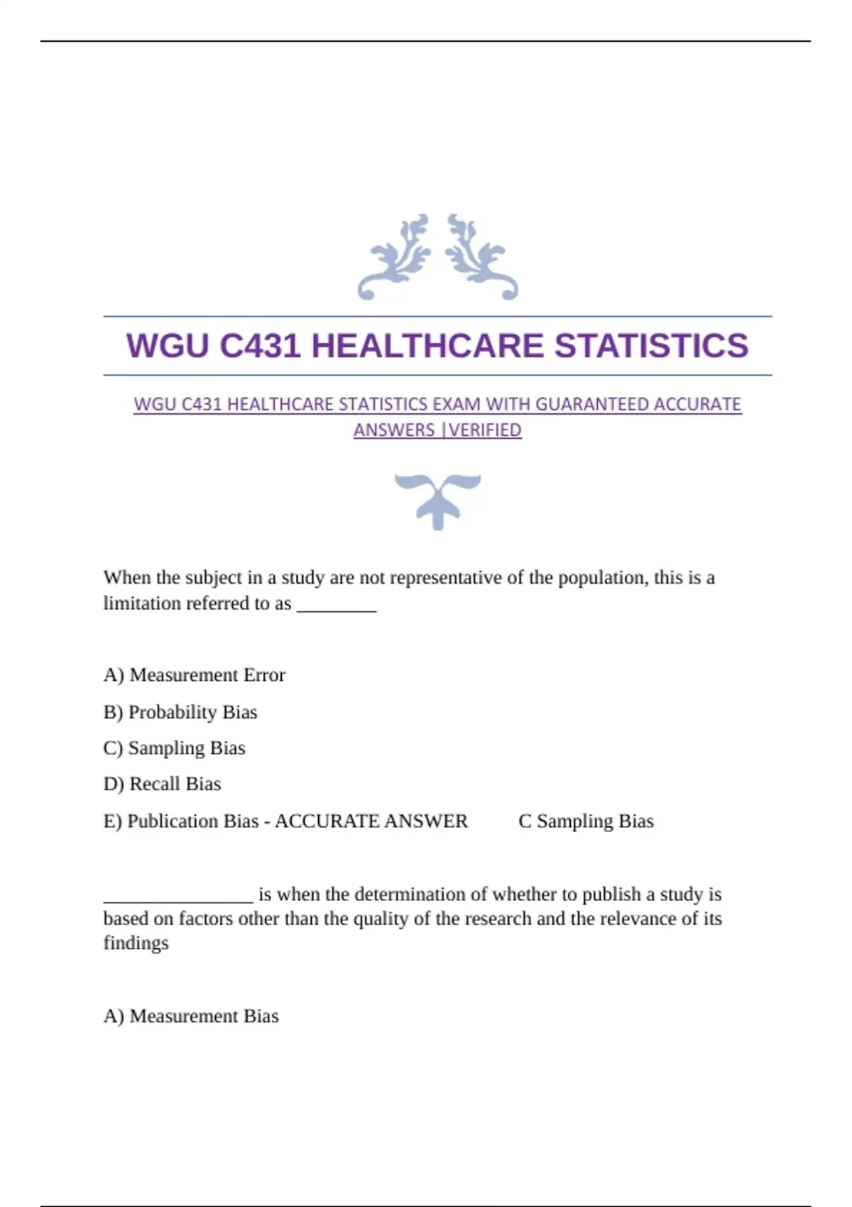 WGU C431 HEALTHCARE STATISTICS EXAM WITH GUARANTEED ACCURATE
