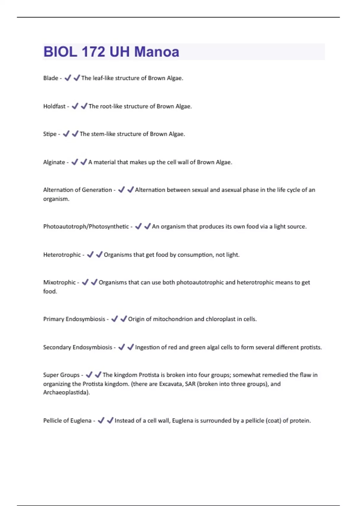 Blade - The leaf-like structure of Brown Algae. Holdfast - The root-like structure of Brown Algae. Stipe - The stem-like structure of Brown Algae. Alginate - A material that makes up the cell wall of Brown Algae. Alternation of Generation - Alternation between sexual and asexual phase in the life cycle of an organism. Photoautotroph/Photosynthetic - An organism that produces its own food via a light source. Heterotrophic - Organisms that get food by consumption, not light. Mixotrophic - Organisms that can use both photoautotrophic and heterotrophic means to get food. Primary Endosymbiosis - Origin of mitochondrion and chloroplast in cells. Secondary Endosymbiosis - Ingestion of red and green algal cells to form several different protists. Super Groups - The kingdom Protista is broken into four groups; somewhat remedied the flaw in organizing the Protista kingdom. (there are Excavata, SAR (broken into three groups), and Archaeoplastida). Pellicle of Euglena - Instead of a cell wall, Euglena is surrounded by a pellicle (coat) of protein.Kineto Plastids - A group of Protists; within the group Euglenosa, which is in the Super Group Excavata. Alveoli - Membrane bound sacs under a plasma membrane. "Hairy Flagellum" of Stramenopile - A flagellum with hair-like appendages; unique to the group Stramenopile. Heterokont - Another word for Stramenopiles. Phytoplankton - A protist that is photosynthetic; have some plant-like characteristics. Red Tide - An effect of an algal bloom (characteristic of Dinoflagellates) Sporozoite - An infectious stage caused by Apiocomplexans; they are the cells released by these organisms that infect the hosts. Apical Complexes Organelle - The organelle that penetrates and infects host cells. Apicoplast - A non-photosynthetic plastid. Cilia - Appendages on the outside of a cell used for locomotion and feeding. Are often smaller than flagella. Macronucleus - A nucleus that functions mostly as a normal nucleus in Ciliates. Micronucleus - A nucleus that functions in sexual and asexual reproduction in Ciliates