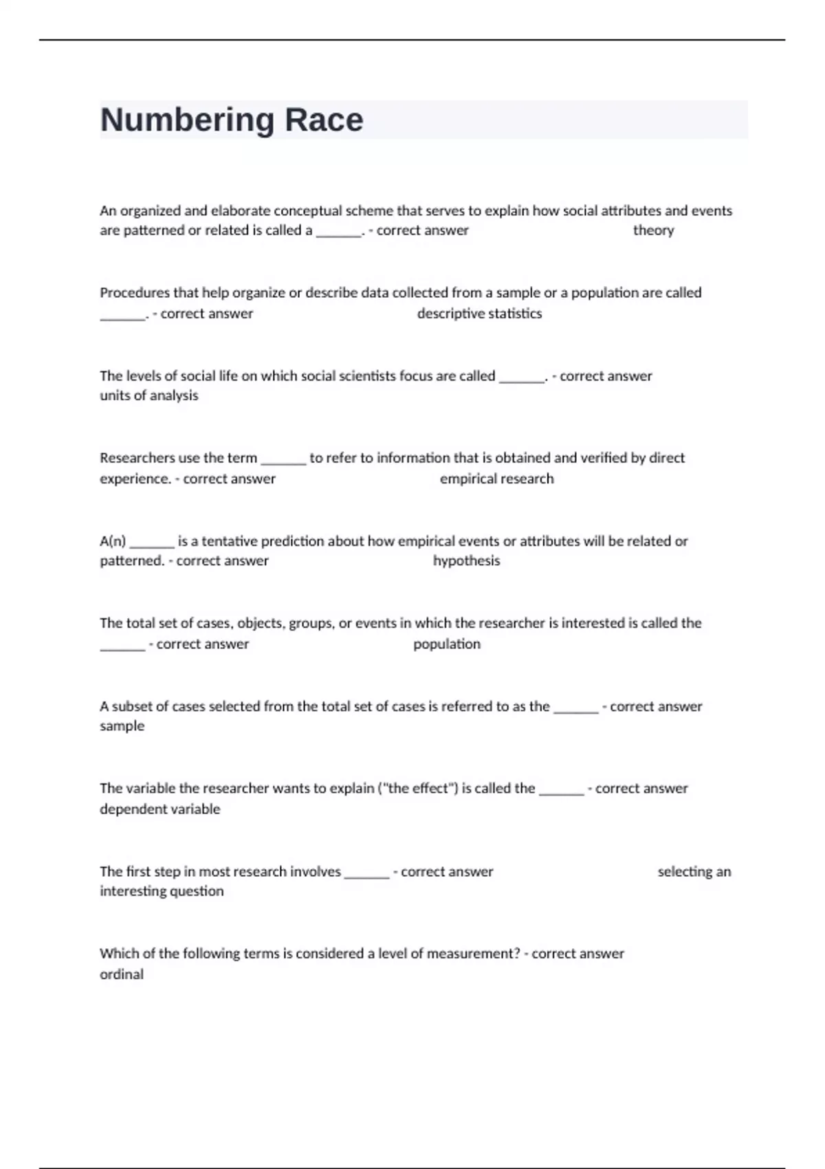 Numbering Race Practice Exam Question Guide Accurately Solved.