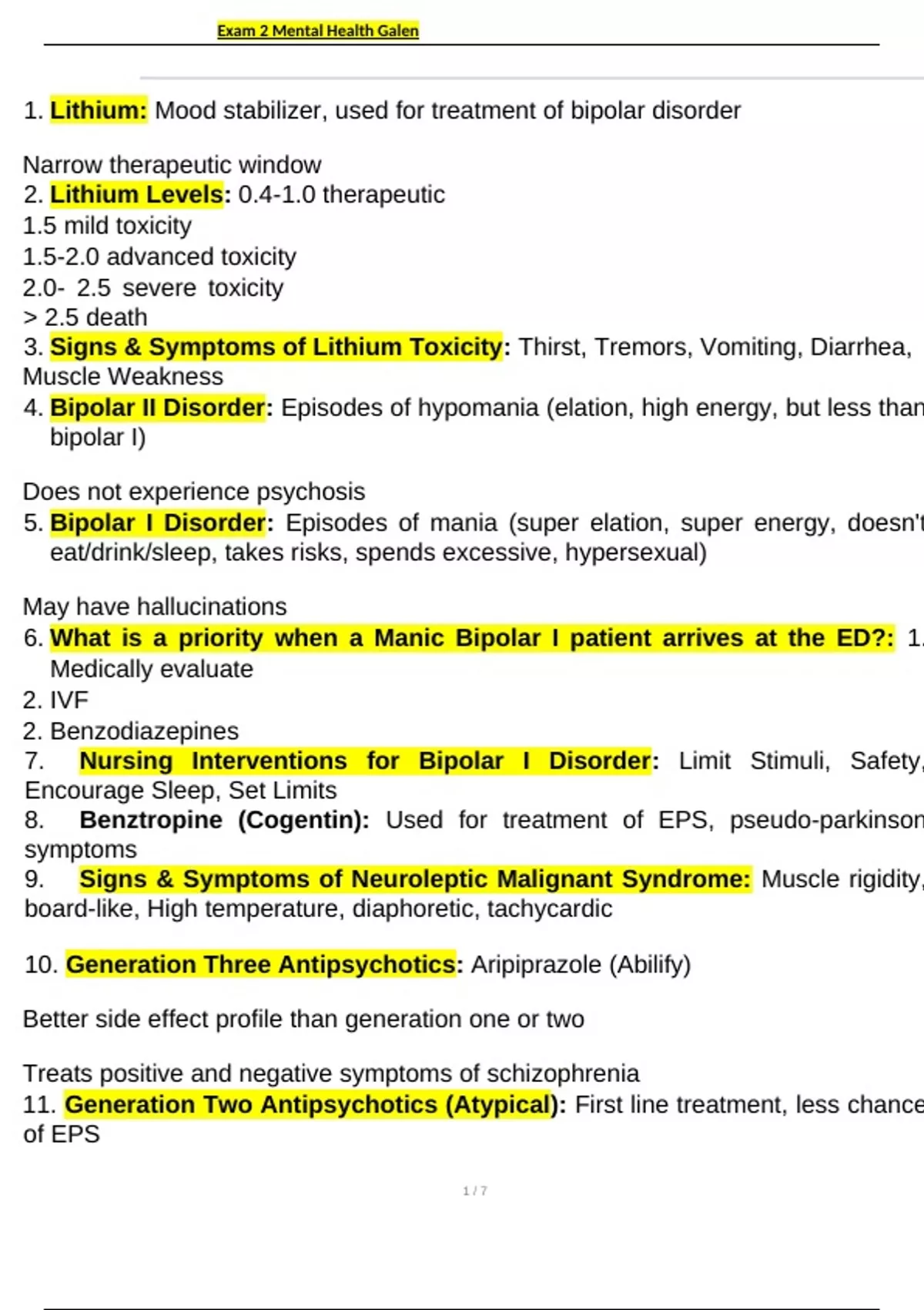1. Lithium: Mood stabilizer, used for treatment of bipolar disorder