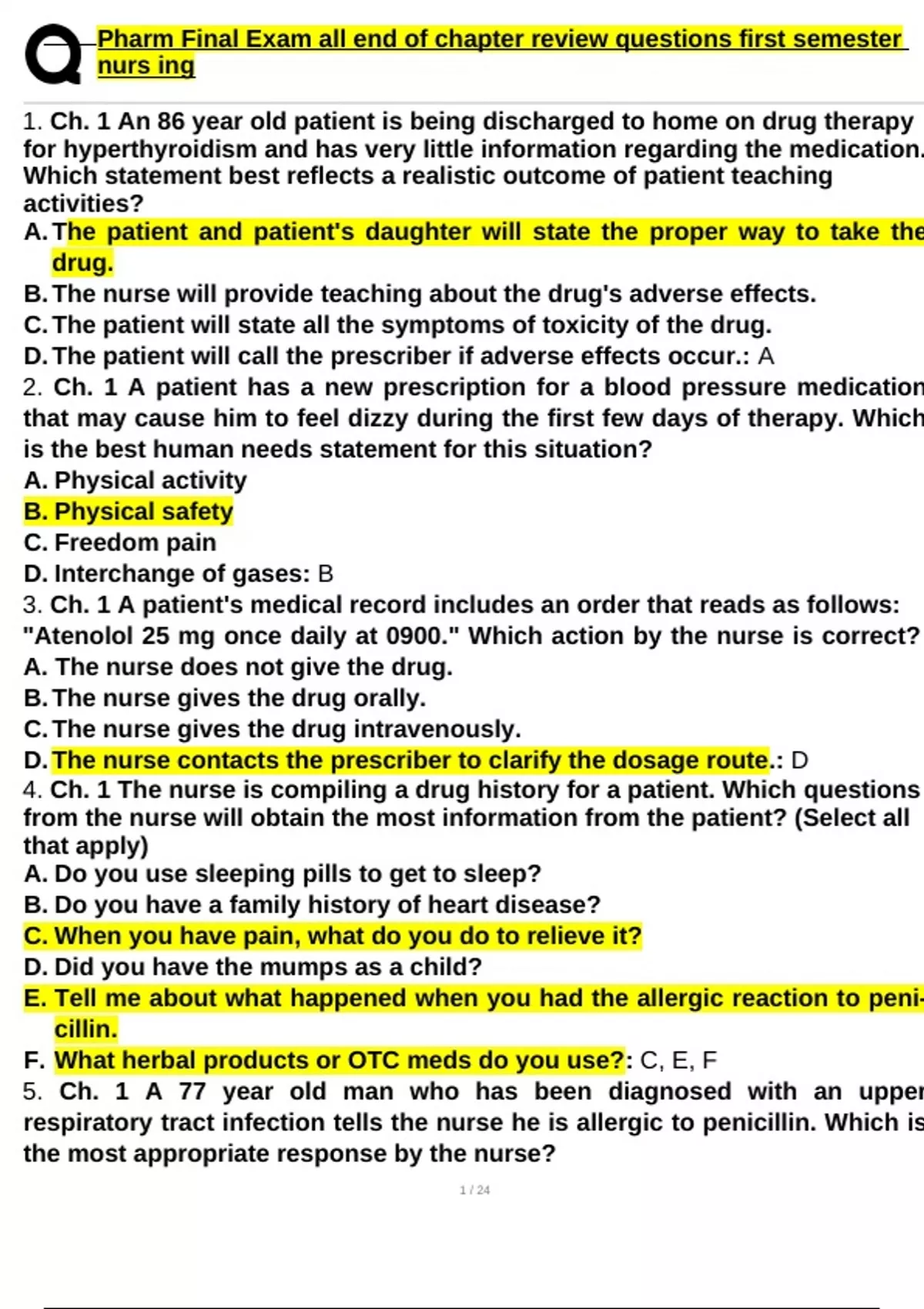 1. Ch. 1 An 86 year old patient is being discharged to home on drug therapy