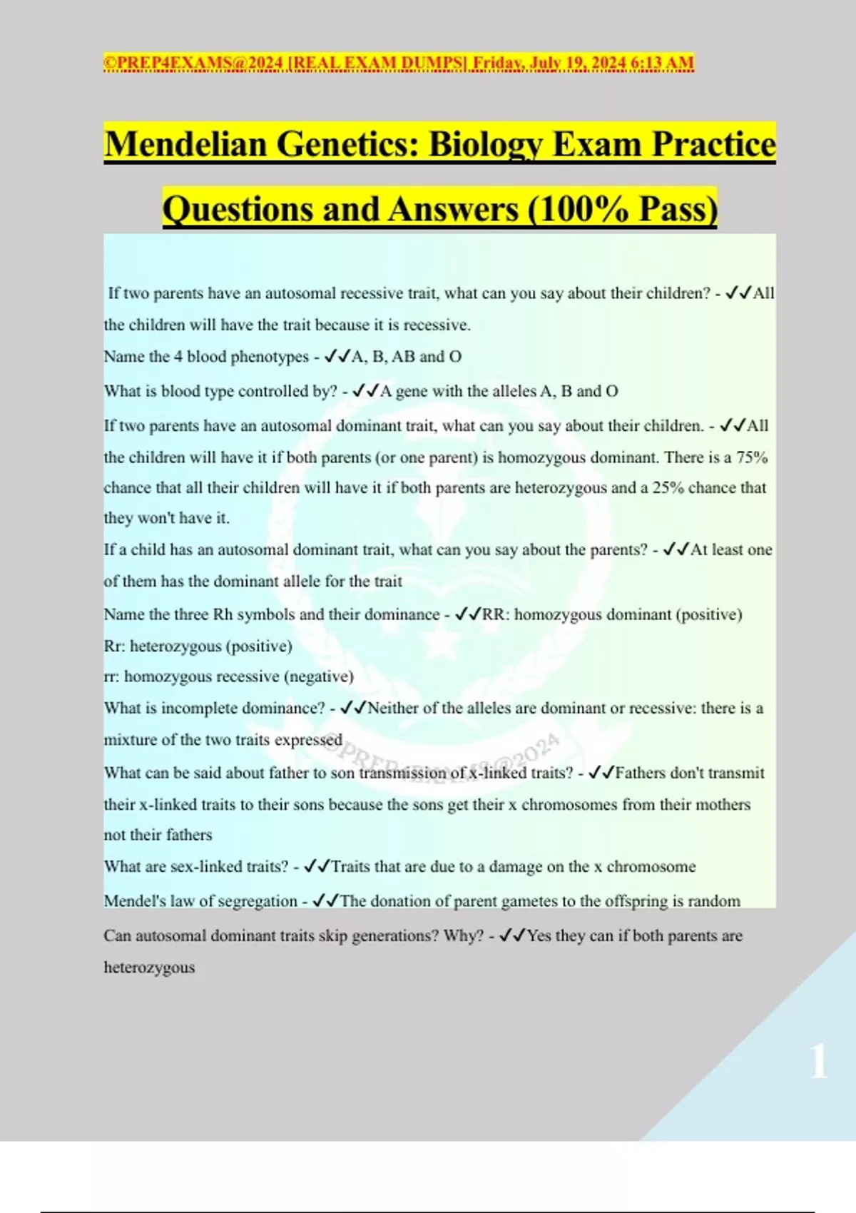 Mendelian Genetics: Biology Exam Practice Questions and Answers (100% Pass)