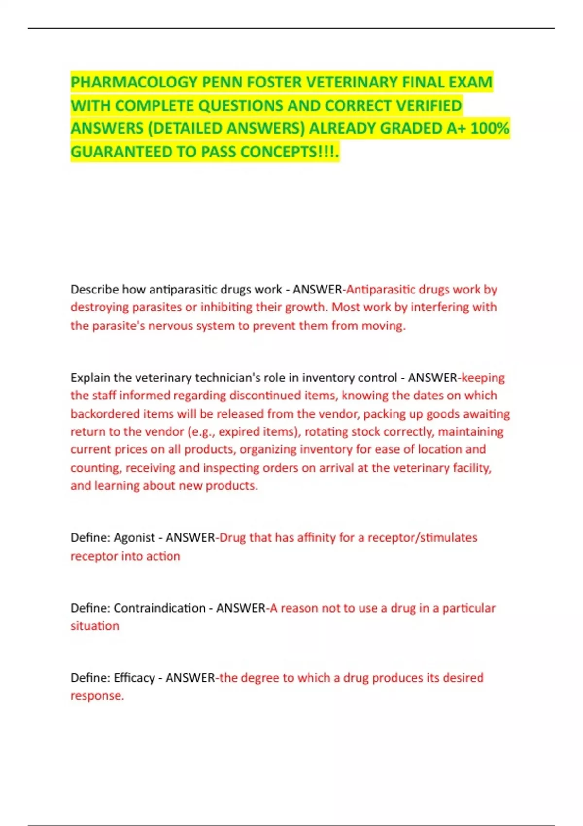 PHARMACOLOGY PENN FOSTER VETERINARY FINAL EXAM WITH COMPLETE QUESTIONS AND CORRECT VERIFIED ANSWERS (DETAILED ANSWERS) ALREADY GRADED A+ 100% GUARANTEED TO PASS CONCEPTS!!!.