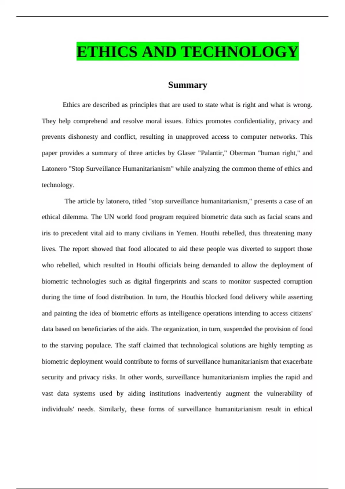 Summary Ethics are described as principles that are used to state what is right and what is wrong. They help comprehend and resolve moral issues. Ethics promotes confidentiality, privacy and prevents dishonesty and conflict, resulting in unapproved access to computer networks. This paper provides a summary of three articles by Glaser "Palantir," Oberman "human right," and Latonero "Stop Surveillance Humanitarianism" while analyzing the common theme of ethics and technology. The article by latonero, titled "stop surveillance humanitarianism," presents a case of an ethical dilemma. The UN world food program required biometric data such as facial scans and iris to precedent vital aid to many civilians in Yemen. Houthi rebelled, thus threatening many lives. The report showed that food allocated to aid these people was diverted to support those who rebelled, which resulted in Houthi officials being demanded to allow the deployment of biometric technologies such as digital fingerprints and scans to monitor suspected corruption during the time of food distribution. In turn, the Houthis blocked food delivery while asserting and painting the idea of biometric efforts as intelligence operations intending to access citizens' data based on beneficiaries of the aids. The organization, in turn, suspended the provision of food to the starving populace. The staff claimed that technological solutions are highly tempting as biometric deployment would contribute to forms of surveillance humanitarianism that exacerbate security and privacy risks. In other words, surveillance humanitarianism implies the rapid and vast data systems used by aiding institutions inadvertently augment the vulnerability of individuals' needs. Similarly, these forms of surveillance humanitarianism result in ethical dilemmas concerning