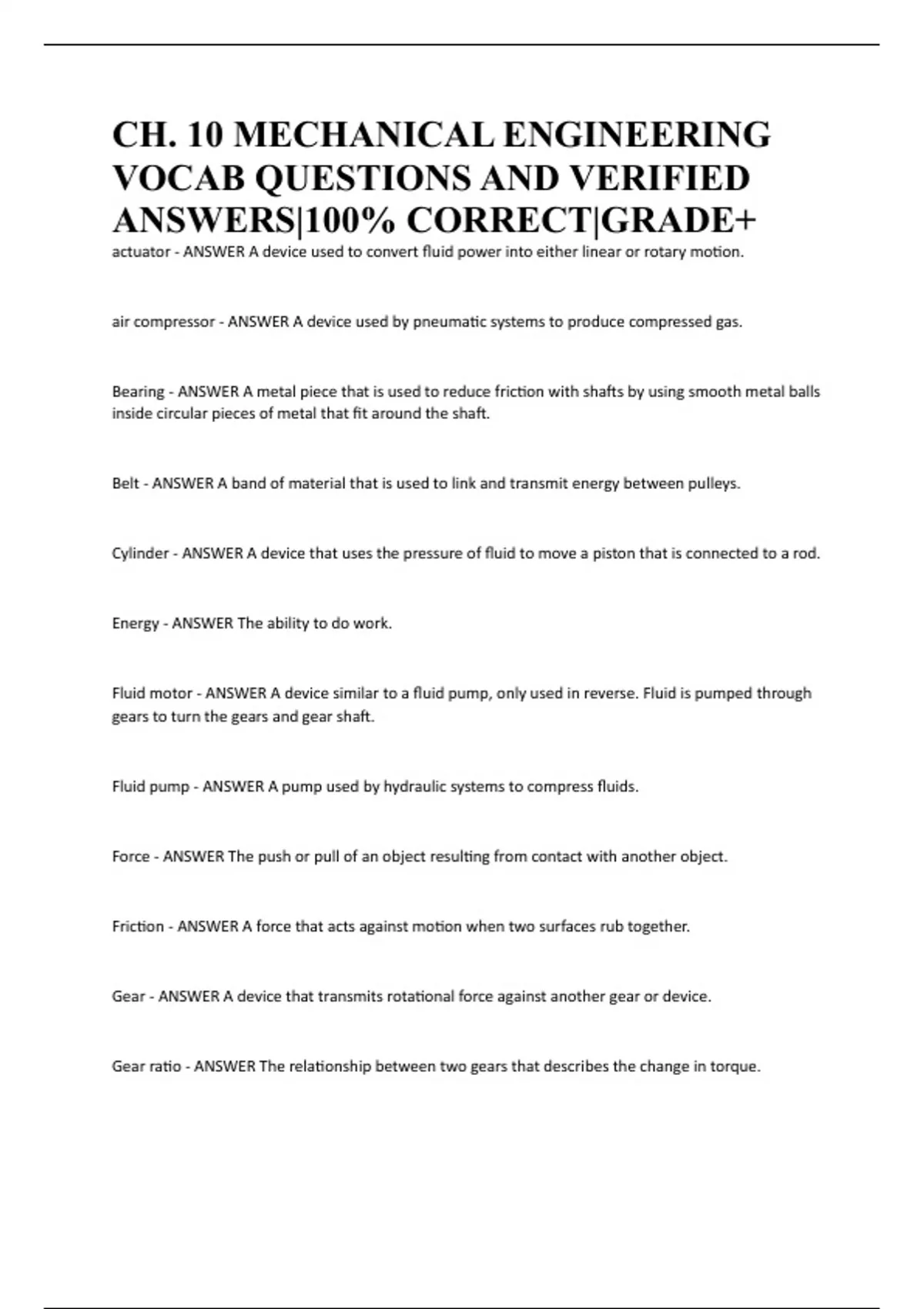 CH. 10 MECHANICAL ENGINEERING VOCAB QUESTIONS AND VERIFIED ANSWERS|100% CORRECT|GRADE+