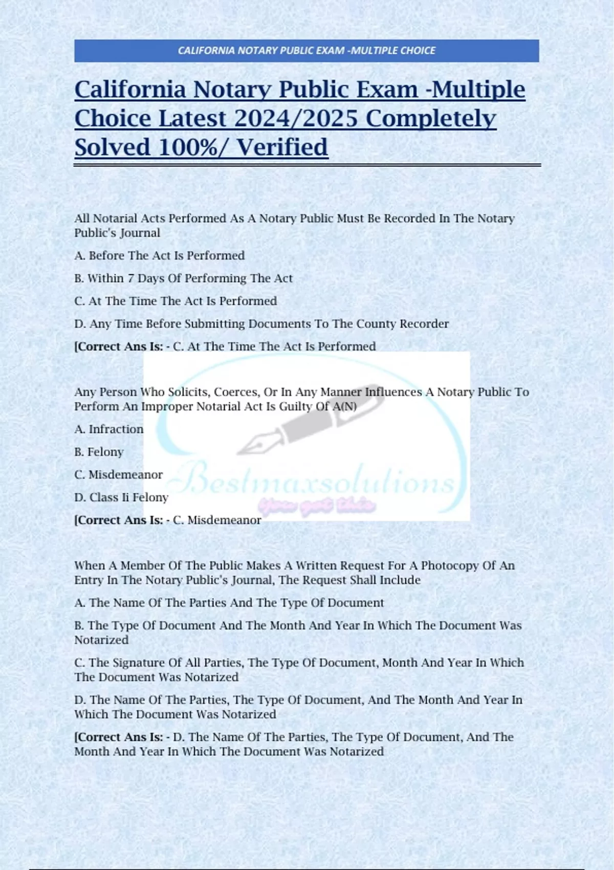 , CALIFORNIA NOTARY PUBLIC EXAM -MULTIPLE CHOICE