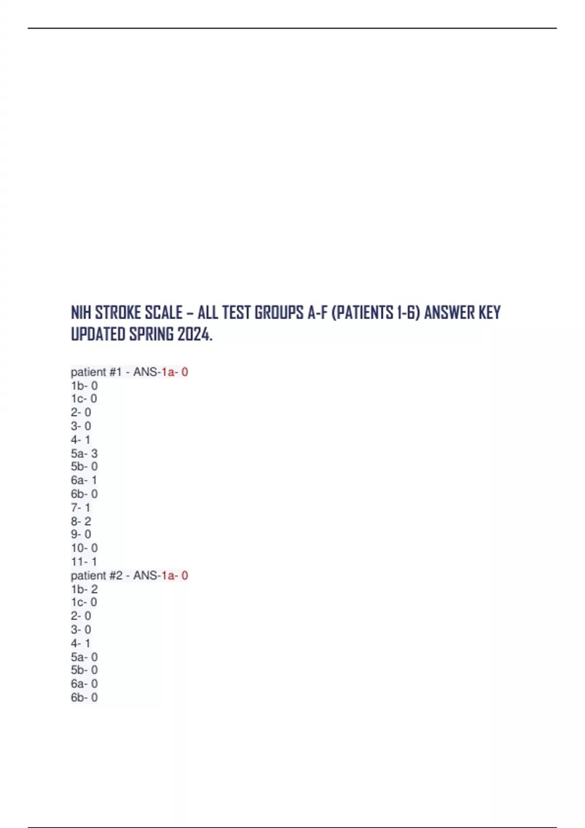 NIH STROKE SCALE – ALL TEST GROUPS A-F (PATIENTS 1-6) ANSWER KEY UPDATED SPRING 2024. patient #1 - ANS-1a- 0 1b- 0 1c- 0 2- 0 3- 0 4- 1 5a- 3 5b- 0 6a- 1 6b- 0 7- 1 8- 2 9- 0 10- 0 11- 1 patient #2 - ANS-1a- 0 1b- 2 1c- 0 2- 0 3- 0 4- 1 5a- 0 5b- 0 6a- 0 6b- 0 7- 0 8- 1 9- 2 10- 1 11- 0 patient #3 - ANS-1a- 0 1b- 0 1c- 0 2- 0 3- 0 4- 1 5a- 0 5b- 0 6a- 2 6b- 2 7- 0 8- 1 9- 0 10- 1 11- 0 patient #4 - ANS-1a- 0 1b- 0 1c- 0 2- 0 3- 0 4- 1 5a- 0 5b- 0 6a- 0 6b- 0 7- 0 8- 1 9- 0 10- 0 11- 0 patient #5 - ANS-1a- 0 1b- 1 1c- 0 2- 0 3- 2 4- 2 5a- 4 5b- 0 6a- 1 6b- 0 7-