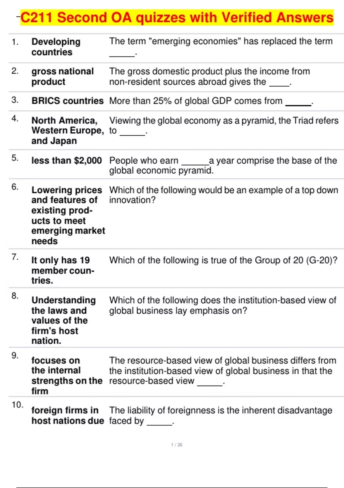 C211 Second OA quizzes with Verified Answers Developing countries gross national product BRICS countries North America, Western Europe, and Japan less than $2,000 Lowering prices and features of existing prod- ucts to meet emerging market needs It only has 19 member coun- tries. Understanding the laws and values of the firm's host nation. focuses on the internal strengths on the firm foreign firms in host nations due The term "emerging economies" has replaced the term . The gross domestic product plus the income from non-resident sources abroad gives the . More than 25% of global GDP comes from . Viewing the global economy as a pyramid, the Triad refers to . People who earn a year comprise the base of the global economic pyramid. Which of the following would be an example of a top down innovation? Which