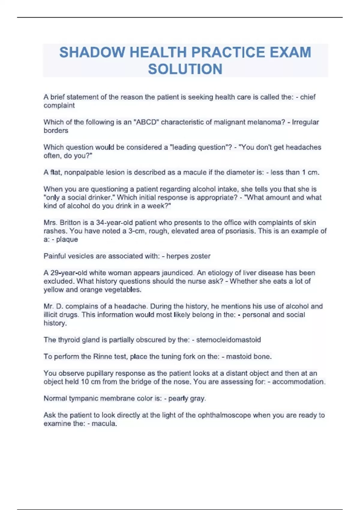 SHADOW HEALTH PRACTICE EXAM SOLUTION