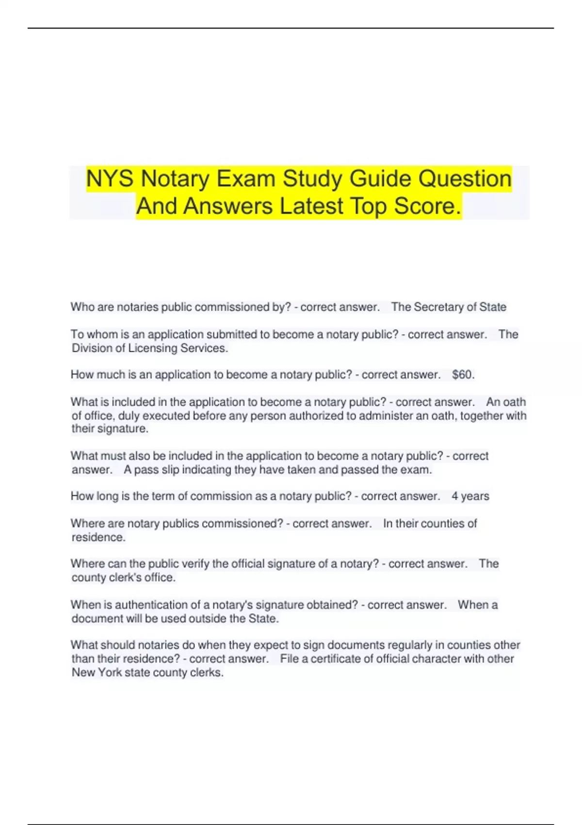 NYS Notary Exam Study Guide Question And Answers Latest Top Score.