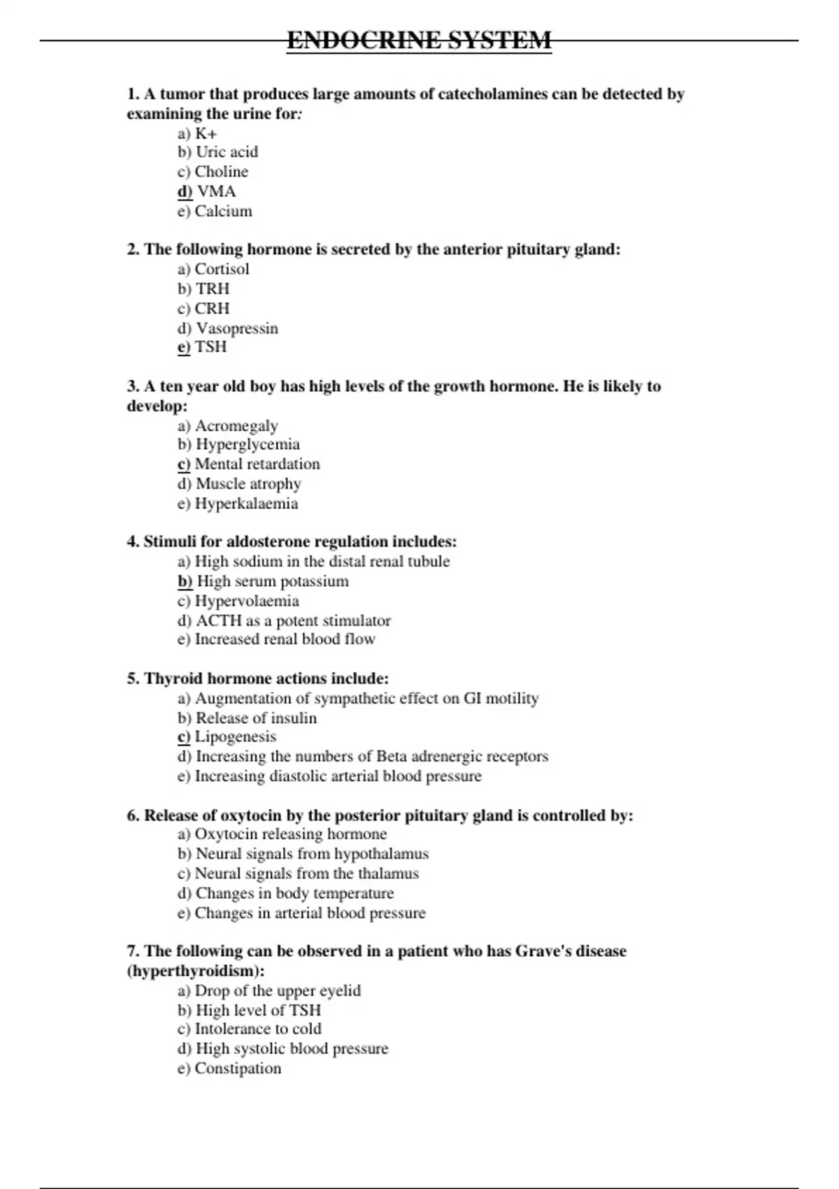 ENDOCRINE SYSTEM 1. A tumor that produces large amounts of catecholamines can be detected by examining the urine for: a) K+ b) Uric acid c) Choline d) VMA e) Calcium 2. The following hormone is secreted by the anterior pituitary gland: a) Cortisol b) TRH c) CRH d) Vasopressin e) TSH 3. A ten year old boy has high levels of the growth hormone. He is likely to develop: a) Acromegaly b) Hyperglycemia c) Mental retardation d) Muscle atrophy e) Hyperkalaemia 4. Stimuli for aldosterone regulation includes: a) High sodium in the distal renal tubule b) High serum potassium c) Hypervolaemia d) ACTH as a potent stimulator e) Increased renal blood flow 5. Thyroid hormone actions include: a) Augmentation of sympathetic effect on GI motility b) Release of insulin c) Lipogenesis d) Increasing the numbers of Beta adrenergic receptors e) Increasing diastolic arterial blood pressure 6. Release of oxytocin by the posterior pituitary gland is controlled by: a) Oxytocin releasing hormone b) Neural signals from hypothalamus c) Neural signals from the thalamus d) Changes in body temperature e) Changes in arterial blood pressure 7. The following can be observed in a patient who has Grave's disease (hyperthyroidism): a) Drop of the upper eyelid b) High level of TSH c) Intolerance to cold d) High systolic blood pressure e) Constipation
