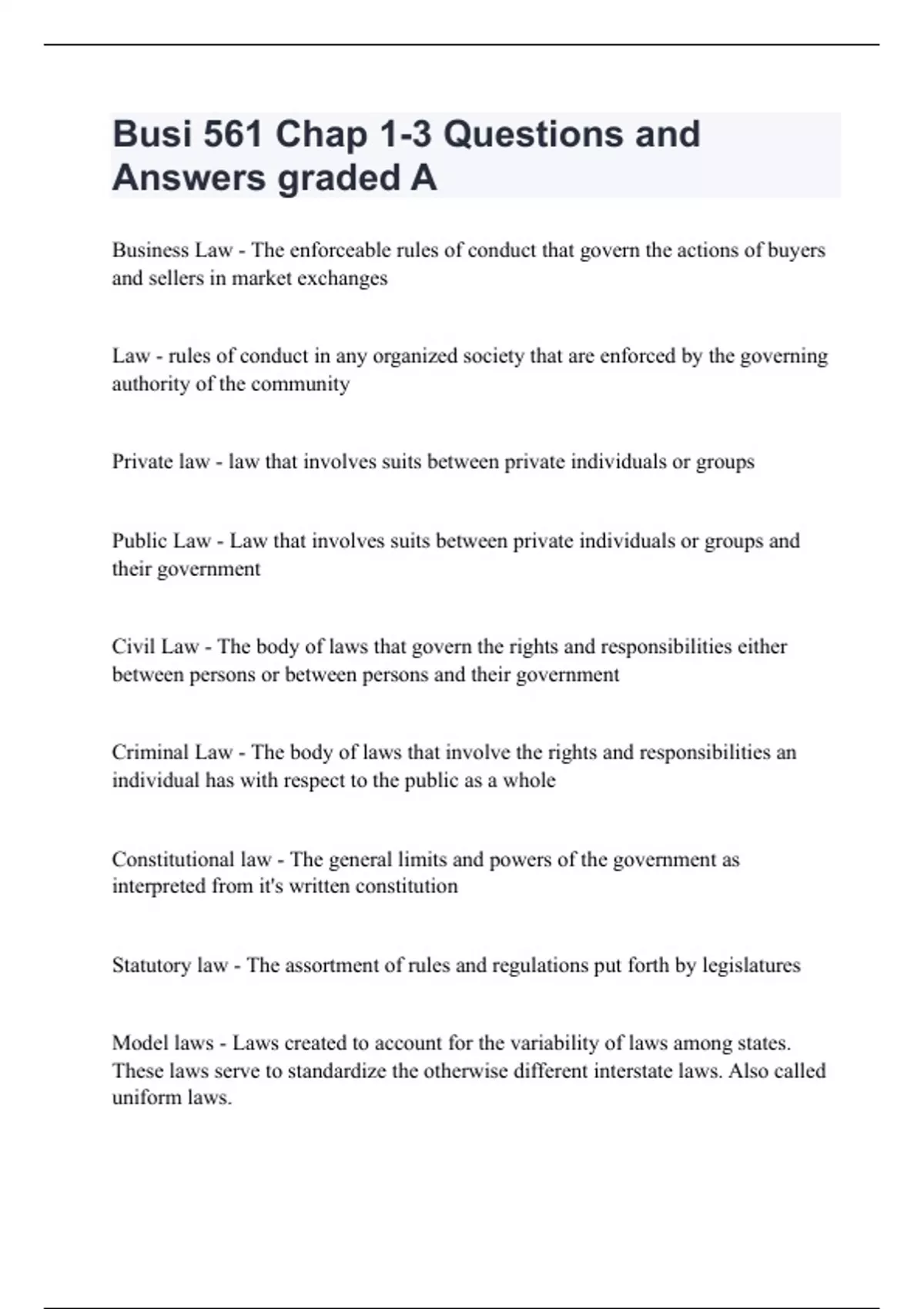 Business Law - The enforceable rules of conduct that govern the actions of buyers and sellers in market exchanges Law - rules of conduct in any organized society that are enforced by the governing authority of the community Private law - law that involves suits between private individuals or groups Public Law - Law that involves suits between private individuals or groups and their government Civil Law - The body of laws that govern the rights and responsibilities either between persons or between persons and their government Criminal Law - The body of laws that involve the rights and responsibilities an individual has with respect to the public as a whole Constitutional law - The general limits and powers of the government as interpreted from it's written constitution Statutory law - The assortment of rules and regulations put forth by legislatures Model laws - Laws created to account for the variability of laws among states. These laws serve to standardize the otherwise different interstate laws. Also called uniform laws. Case Law - The collection of legal interpretation is made by judges. They are considered to be law unless otherwise revoked by statutory law. Also known as common law Precident - A tool used by judges to make rulings on cases on the basis of key similarities to previous cases stare decisis - Standing by the decision; a principal stating that rolls made in higher courts are binding president for lower courts Restatement of the law - Summaries of common law rules in a particular area of the law. Restatements do not carry the weight of law but can be used to guide interpretations of particular cases. Administrative law - The collection of rules and decisions made by administrative agencies to feel in particular details missing from constitutions and statutes Natural law - A school of jurisprudence that recognizes the existence of higher law, or law that is morally superior to human lives Legal positivism - School of jurisprudence that holds that because society requires authority, illegal and authoritarian hierarchy should exist. When a law is made, therefore, obedience is expected because authority created it Identification with the vulnerable - A school of jurisprudence that whole is that society should be fair. Particular attention is therefore paid to the poor, the ill and the elderly. Historical school - A school of jurisprudence that uses traditions as the model for future lies and behavior. Also called tradition or custom Legal realism - A school of jurisprudence that holds that context must be considered as well as law. Context includes factors such as economic conditions and social conditions