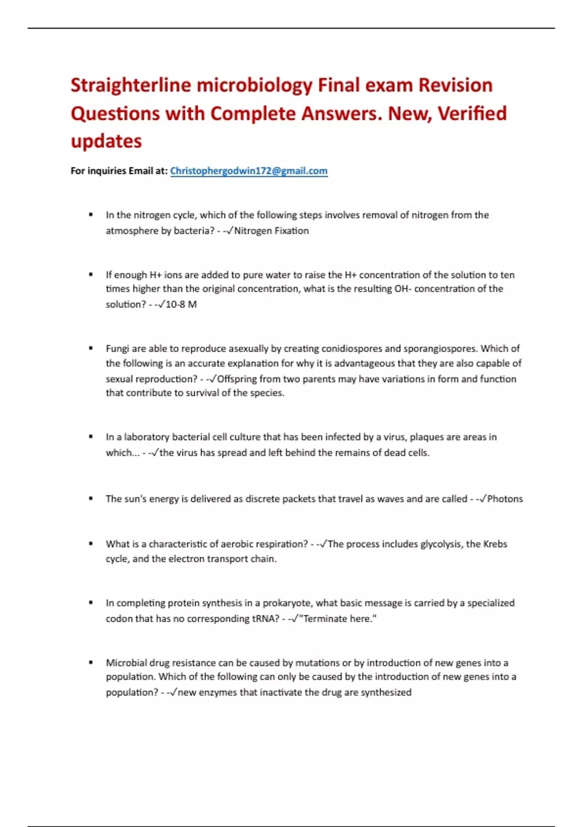 Straighterline microbiology Final exam Revision Questions with Complete Answers. New, Verified updates