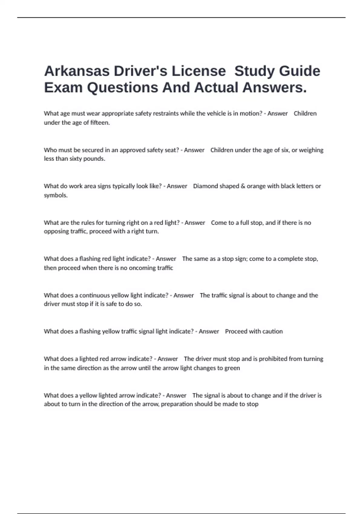 Arkansas Driver's License Study Guide Exam Questions And Actual Answers.