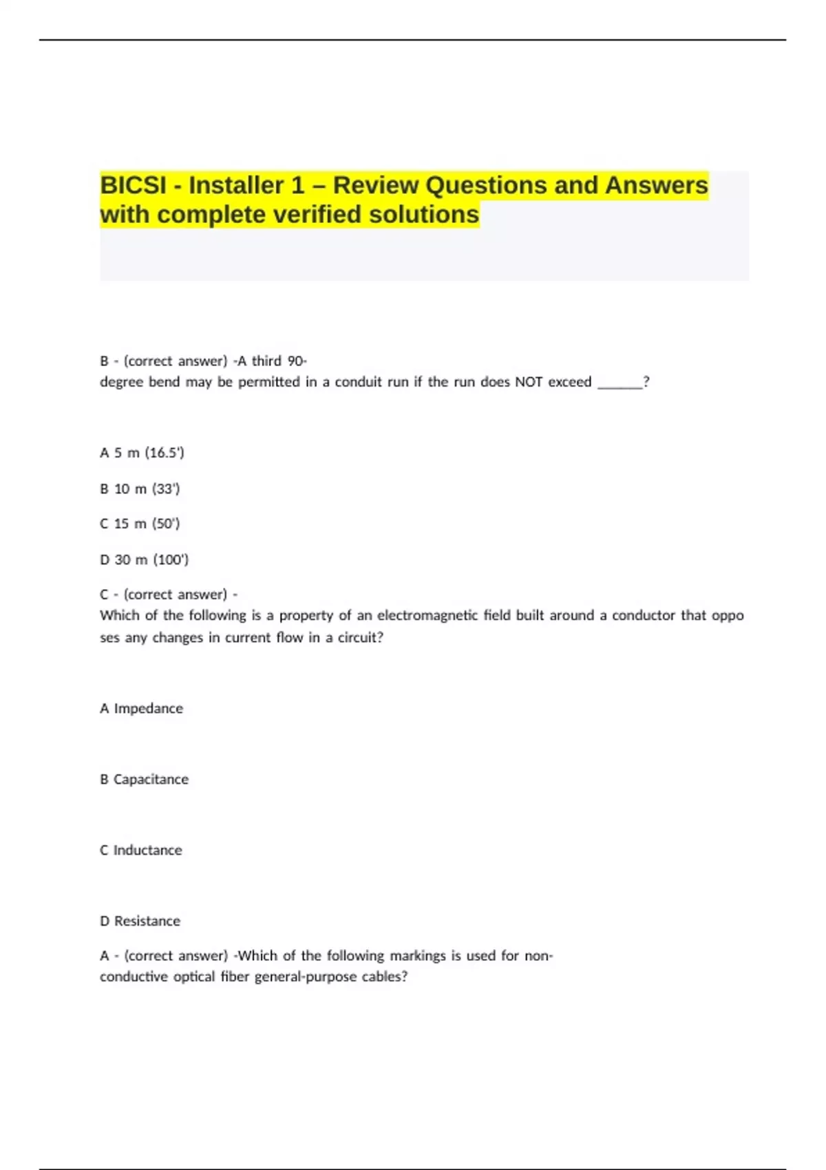 BICSI - Installer 1 – Review Questions and Answers with complete verified solutions.