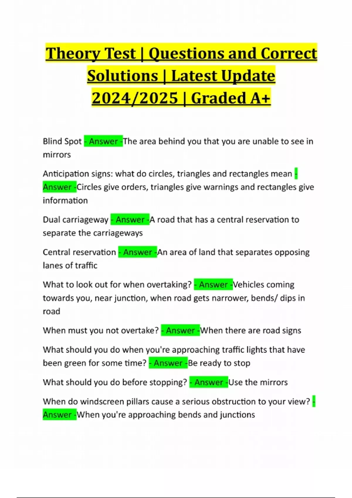 Theory Test | Questions and Correct Solutions | Latest Update 2024/2025 | Graded A+ Blind Spot - Answer -The area behind you that you are unable to see in mirrors Anticipation signs: what do circles, triangles and rectangles mean - Answer -Circles give orders, triangles give warnings and rectangles give information Dual carriageway - Answer -A road that has a central reservation to separate the carriageways Central reservation - Answer -An area of land that separates opposing lanes of traffic What to look out for when overtaking? - Answer -Vehicles coming towards you, near junction, when road gets narrower, bends/ dips in road When must you not overtake? - Answer -When there are road signs What should you do when you're approaching traffic lights that have been green for some time? - Answer -Be ready to stop What should you do before stopping? - Answer -Use the mirrors When do windscreen pillars cause a serious obstruction to your view? - Answer -When you're approaching bends and junctionsYou can't see clearly behind when reversing. What should you do? - Answer -Ask someone to guide you