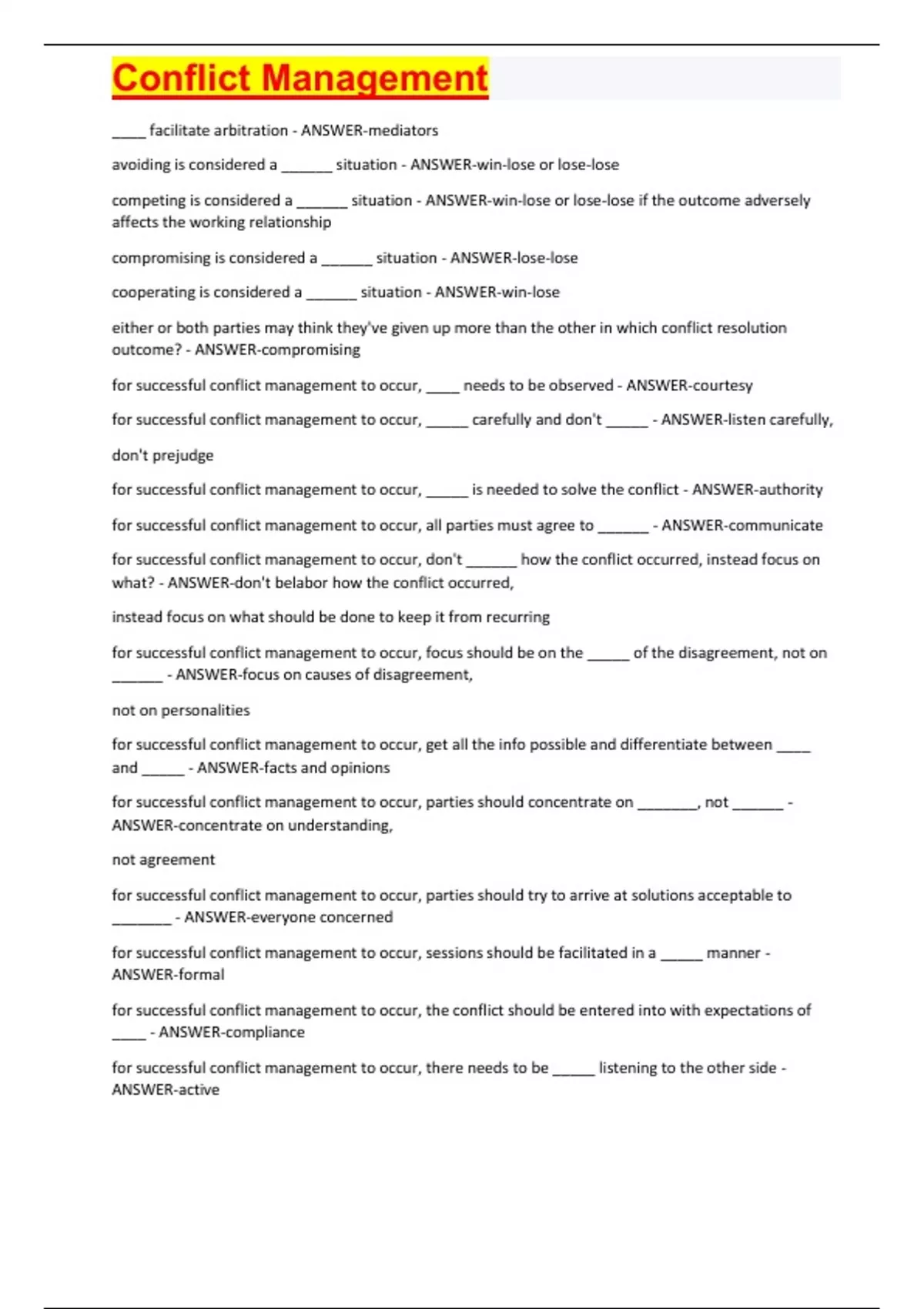 for successful conflict management to occur, all parties must agree to ______ - ANSWER-communicate