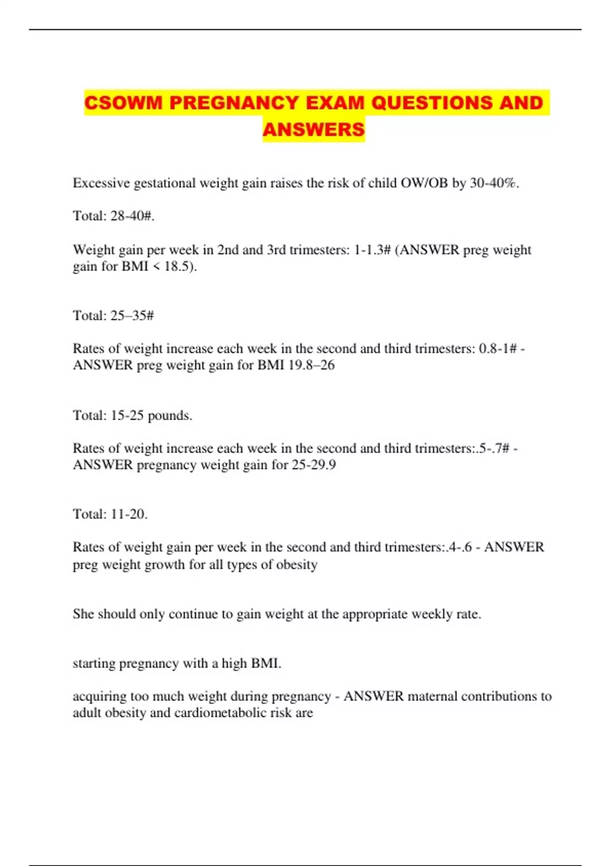 CSOWM PREGNANCY EXAM QUESTIONS AND ANSWERS...