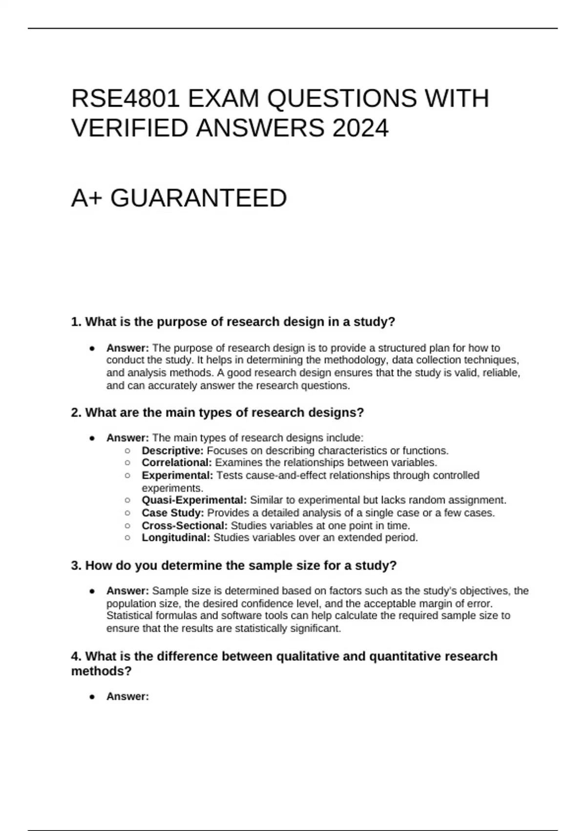 This document provides general EXAM questions and answers on research methods, design, ethics, data analysis, and statistical concepts. 100% TRUSTED WORKINGS