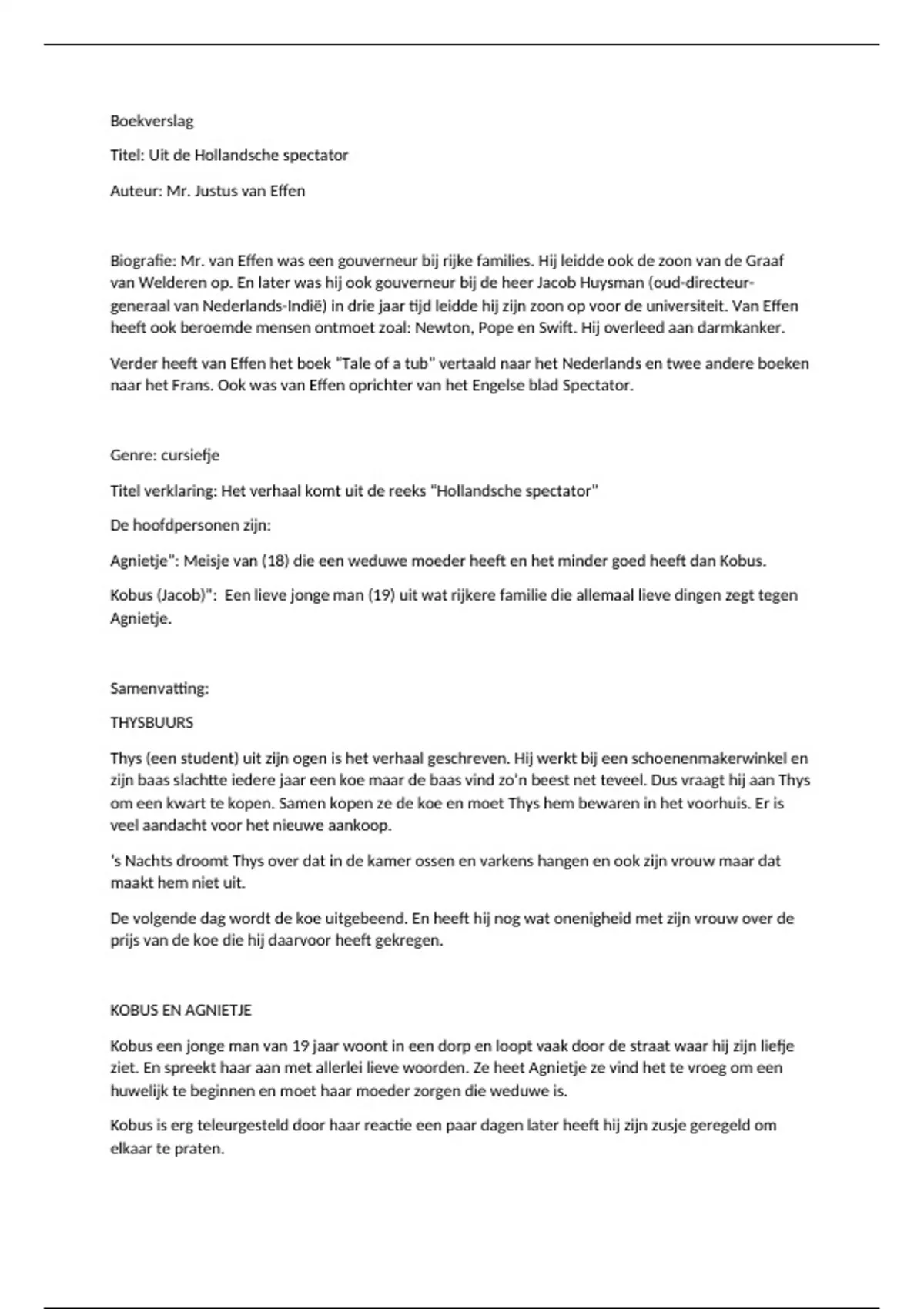 Samenvatting Boekverslag: Uit de Hollandsche spectator Auteur: Justus van Effen