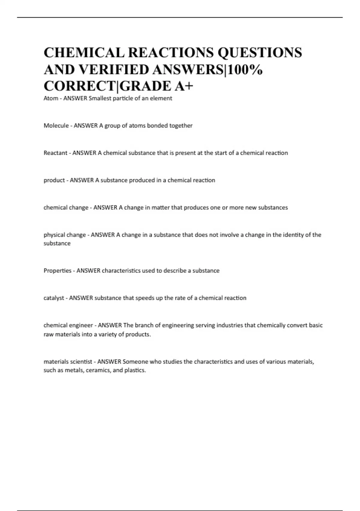 Reactant - ANSWER A chemical substance that is present at the start of a chemical reaction