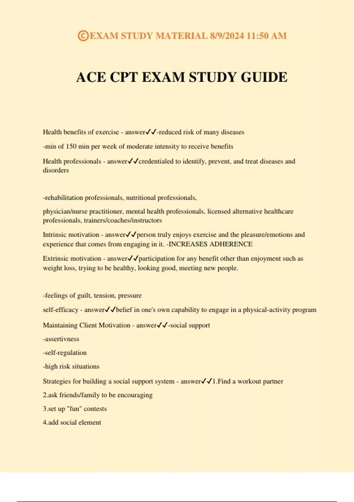 ACE CPT EXAM STUDY GUIDE Health benefits of exercise - answer-reduced risk of many diseases -min of 150 min per week of moderate intensity to receive benefits Health professionals - answercredentialed to identify, prevent, and treat diseases and disorders -rehabilitation professionals, nutritional professionals, physician/nurse practitioner, mental health professionals, licensed alternative healthcare professionals, trainers/coaches/instructors Intrinsic motivation - answerperson truly enjoys exercise and the pleasure/emotions and experience that comes from engaging in it. -INCREASES ADHERENCE Extrinsic motivation - answerparticipation for any benefit other than enjoyment such as weight loss, trying to be healthy, looking good, meeting new people. -feelings of guilt, tension, pressure self-efficacy - answerbelief in one's own capability to engage in a physical-activity program Maintaining Client Motivation - answer-social support -assertivness -self-regulation -high risk situations Strategies for building a social support system - answer1.Find a workout partner friends/family to be encouraging up "fun" contests social element ©EXAM STUDY MATERIAL 8/9/2024 11:50 AM 5. find an enjoyable activity Fighting negative social influences - answer1. Balance time w/unsupportive people and supportive people 2. set limits on how much time is spent with unsupportive people 3. mentally prepare lly review in to them why exercise is important for you Maintaining client motivation: Assertiveness - answerhonest, straightforward expression of thoughs, feelings, and beliefs Maintaining client motivation: Self-regulation - answerteach clients to take control over their behavior instead of doing it for them Maintaining client motivation: High risk situations - answerteach clients to be prepared for barriers and relapses and have a plan of action for when high-risk situations occur ` Influences on adherence and participation: Personal attributes - answer*demographic variables* *health status* -people w/diseases are less likely to exercise than healthy individuals *activity history* ©EXAM STUDY MATERIAL 8/9/2024 11:50 AM *psychological traits* *knowledge, attitudes, beliefs* Locus of control - answerbelief in personal control over health outcomes- increases adherence Influences on adherence: environmental factors - answer-access to facilities (should be closer to them for increase of adherence) -time (change by goal setting, prioritizing, organizing time) -social support (should be positive in order to support adherence) Influences on adherence and participation-physical activity factors - answer-intensity (if program is too intense , it can cause dropout. should start at moderate intensity and slowly inc according to their HR Reserve or V02 Max) -injury Feedback: extrinsic feedback - answerreinforcment, error correction, encouragement -this feedback is great but clients should not rely on it Feedback: intrinsic feedback - answerinformation that the clients provide themselves based on own sensory system( what they feel, see, hear) -increases adherence Feedback: Knowledge of results - answerincreases adherence -provides info on progress Leadership qualities of trainer - answer-professionalism ©EXAM STUDY MATERIAL 8/9/2024 11:50 AM -trust and credibility -demonstrates listening abilities -demonstrates excitement for their job -continuing to show clients they care -takes time to think about clients experiences through clients eyes How trainer can help build adherence: program design - answerpt must be able to design a program with regard to each clients preferences , schedule, experience, apprehensions and constraints How trainer can help build adherence: role clarity - answer-responsibilities and expectations of both parties How trainer can help build adherence: goal setting - answer-avoid setting too many goals -set short term and long term goals -avoid setting negative goals -revisit goals on regular basis SMART -Specific -clear/defined. not too general -Measurable-to keep track -attainable-actions to attain plan/goal -relevant-realistic, not too hard -time-bound -ex 3months How the trainer can help build adherence: contract agreements - answercreating clarity related to expectations and goals through written agreements and contracts Client-trainer relationship - answerRapport, investigation, planning, action Client-trainer relationship: RAPPORT STAGE - answer-Mutual understanding and trust in a relationship both verbal and nonverbal Rapport stage - answerinitial stage
