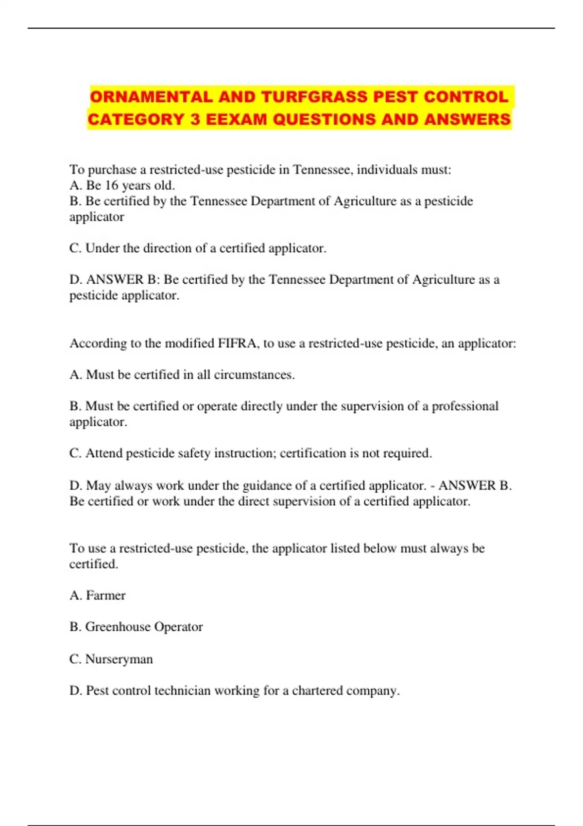 D. May always work under the guidance of a certified applicator. - ANSWER B.