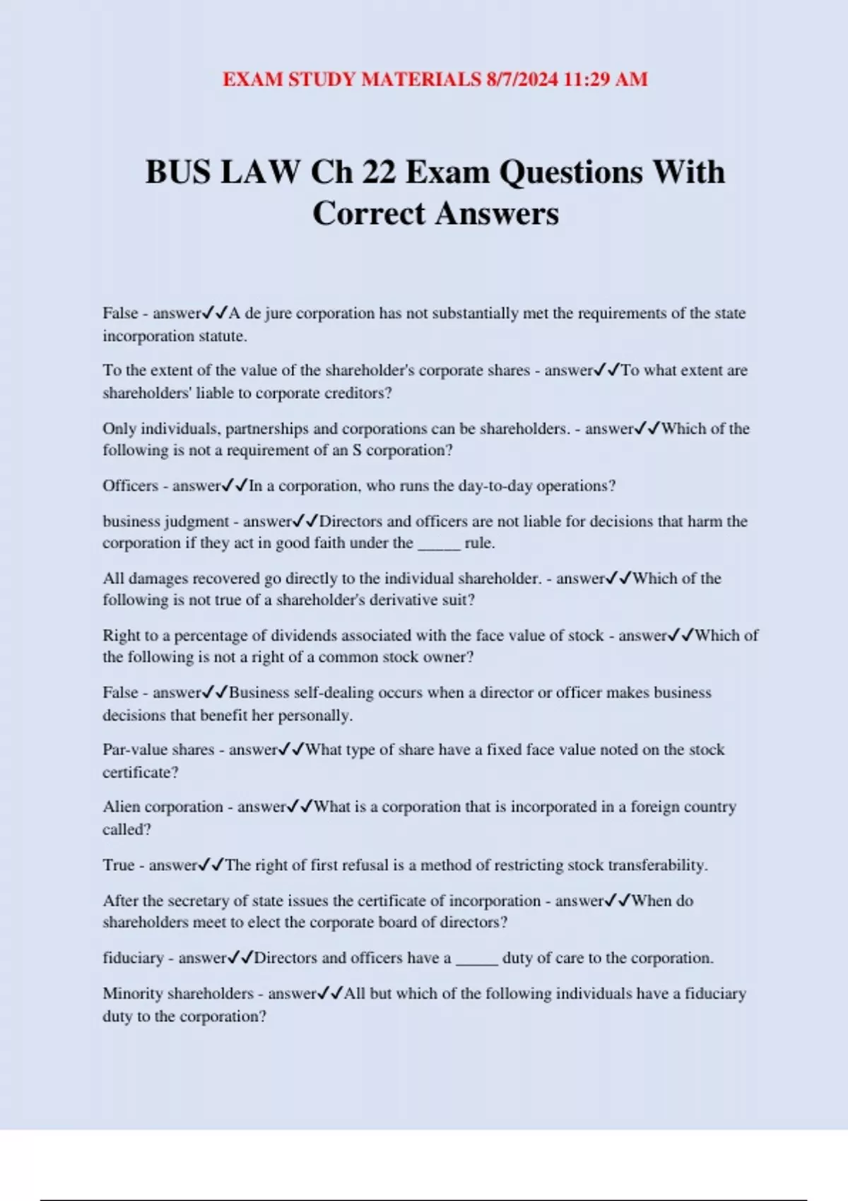 BUS LAW Ch 22 Exam Questions With Correct Answers False - answerA de jure corporation has not substantially met the requirements of the state incorporation statute. To the extent of the value of the shareholder's corporate shares - answerTo what extent are shareholders' liable to corporate creditors? Only individuals, partnerships and corporations can be shareholders. - answerWhich of the following is not a requirement of an S corporation? Officers - answerIn a corporation, who runs the day-to-day operations? business judgment - answerDirectors and officers are not liable for decisions that harm the corporation if they act in good faith under the _____ rule. All damages recovered go directly to the individual shareholder. - answerWhich of the following is not true of a shareholder's derivative suit? Right to a percentage of dividends associated with the face value of stock - answerWhich of the following is not a right of a common stock owner? False - answerBusiness self-dealing occurs when a director or officer makes business decisions that benefit her person