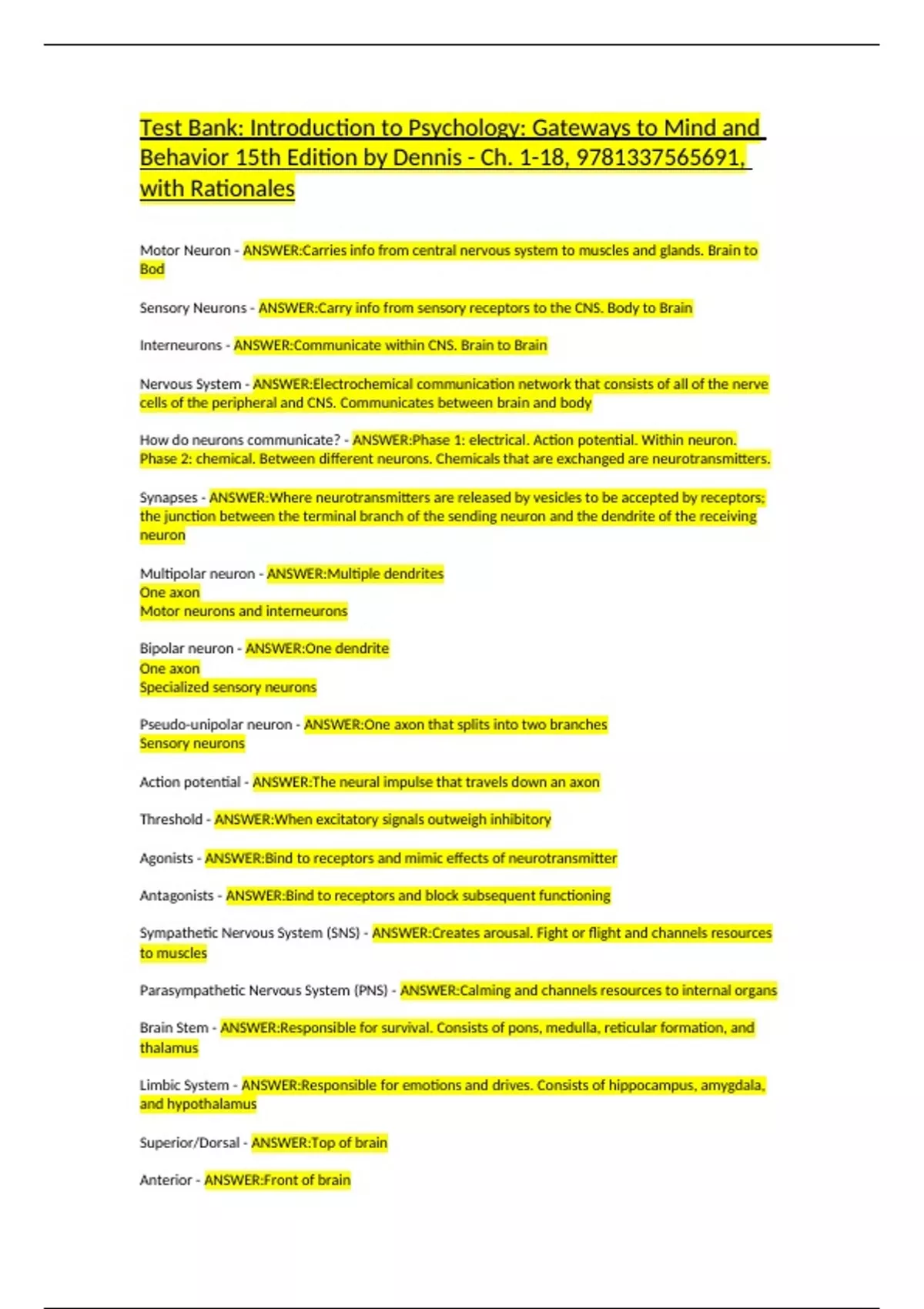 Test Bank: Introduction to Psychology: Gateways to Mind and