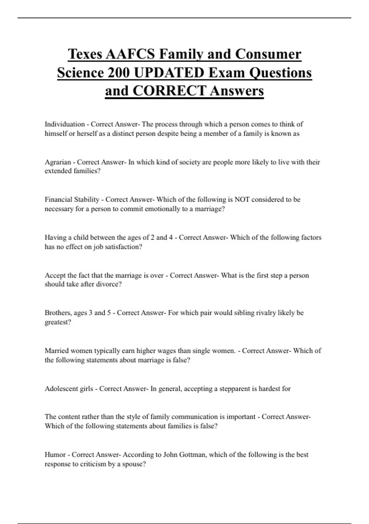 Texes AAFCS Family and Consumer Science 200 UPDATED Exam Questions and CORRECT Answers Individuation - Correct Answer- The process through which a person comes to think of himself or herself as a distinct person despite being a member of a family is known as Agrarian - Correct Answer- In which kind of society are people more likely to live with their extended families? Financial Stability - Correct Answer- Which of the following is NOT considered to be necessary for a person to commit emotionally to a marriage?
