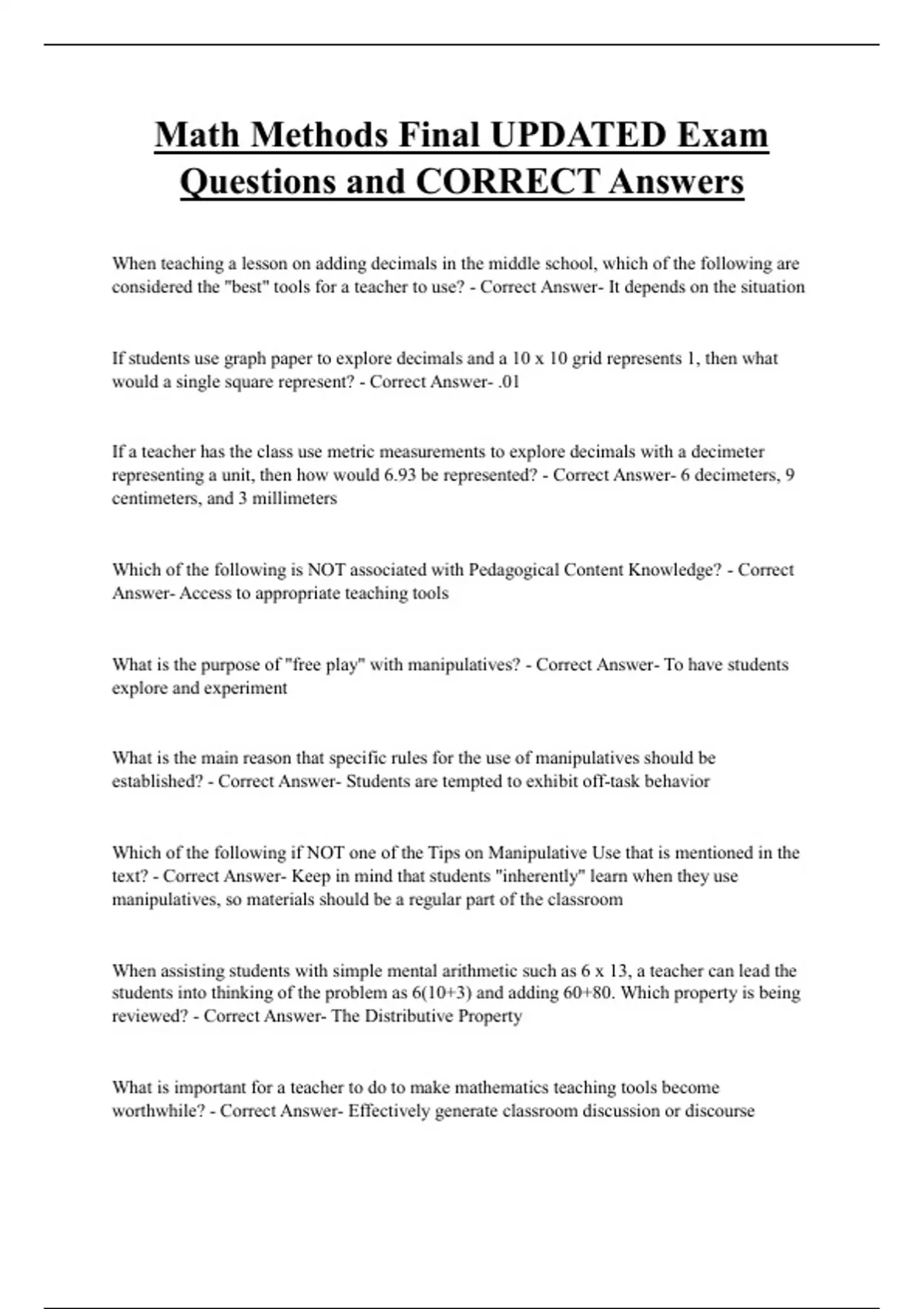 Math Methods Final UPDATED Exam Questions and CORRECT Answers When teaching a lesson on adding decimals in the middle school, which of the following are considered the "best" tools for a teacher to use? - Correct Answer- It depends on the situation If students use graph paper to explore decimals and a 10 x 10 grid represents 1, then what would a single square represent? - Correct Answer- .01 If a teacher has the class use metric measurements to explore decimals with a decimeter representing a unit, then how would 6.93 be represented? - Correct Answer- 6 decimeters, 9 centimeters, and 3 millimeters