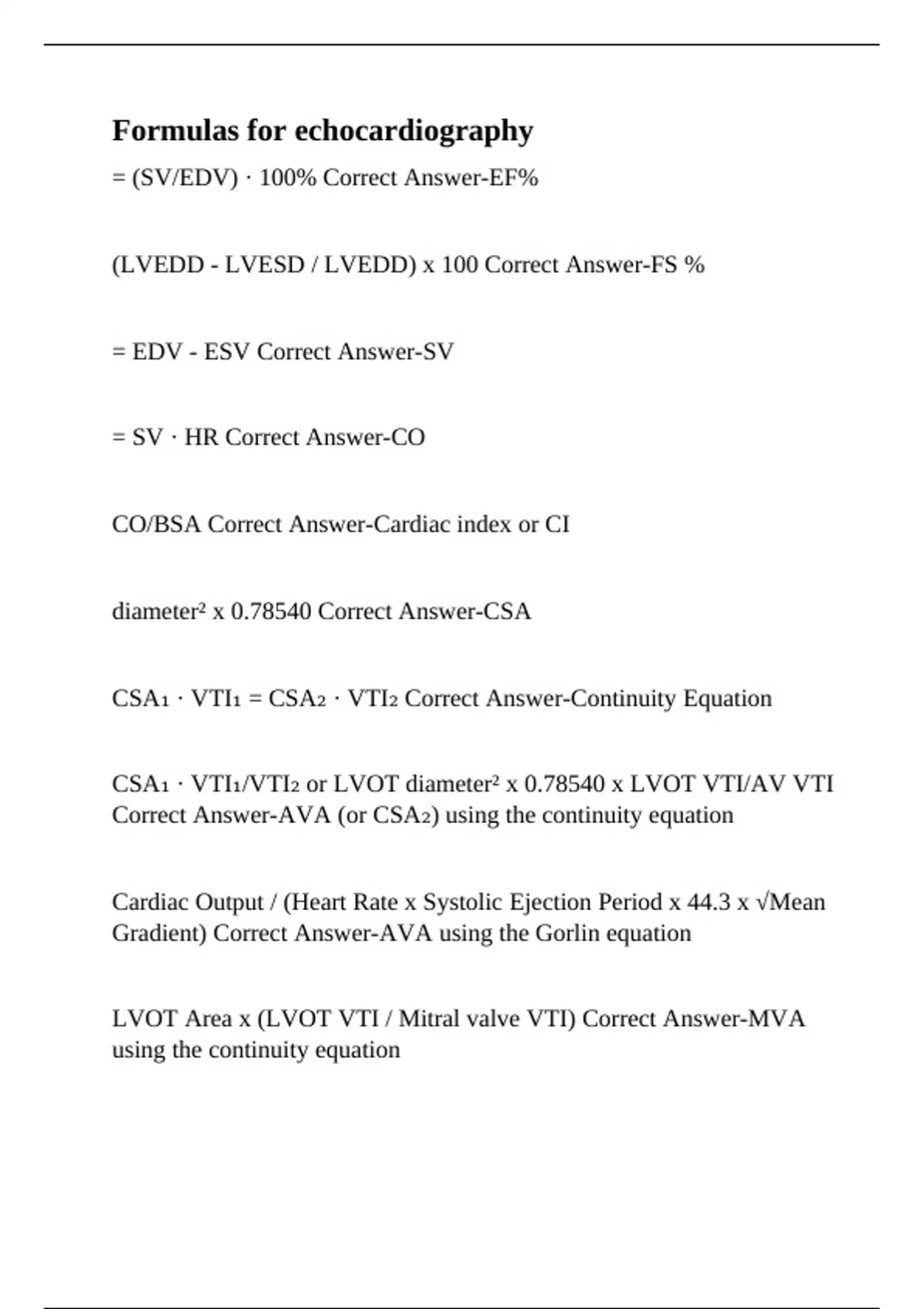 = (SV/EDV) · 100% Correct Answer-EF% (LVEDD - LVESD / LVEDD) x 100 Correct Answer-FS % = EDV - ESV Correct Answer-SV = SV · HR Correct Answer-CO CO/BSA Correct Answer-Cardiac index or CI diameter² x 0.78540 Correct Answer-CSA CSA₁ · VTI₁ = CSA₂ · VTI₂ Correct Answer-Continuity Equation CSA₁ · VTI₁/VTI₂ or LVOT diameter² x 0.78540 x LVOT VTI/AV VTI Correct Answer-AVA (or CSA₂) using the continuity equation Cardiac Output / (Heart Rate x Systolic Ejection Period x 44.3 x √Mean Gradient) Correct Answer-AVA using the Gorlin equation LVOT Area x (LVOT VTI / Mitral valve VTI) Correct Answer-MVA using the continuity equation 0.85 x AVA Correct Answer-MVA using the Gorlin equation 759/DT Correct Answer-MVA using MV decel time 220/PHT Correct Answer-MVA using MV pressure half-time