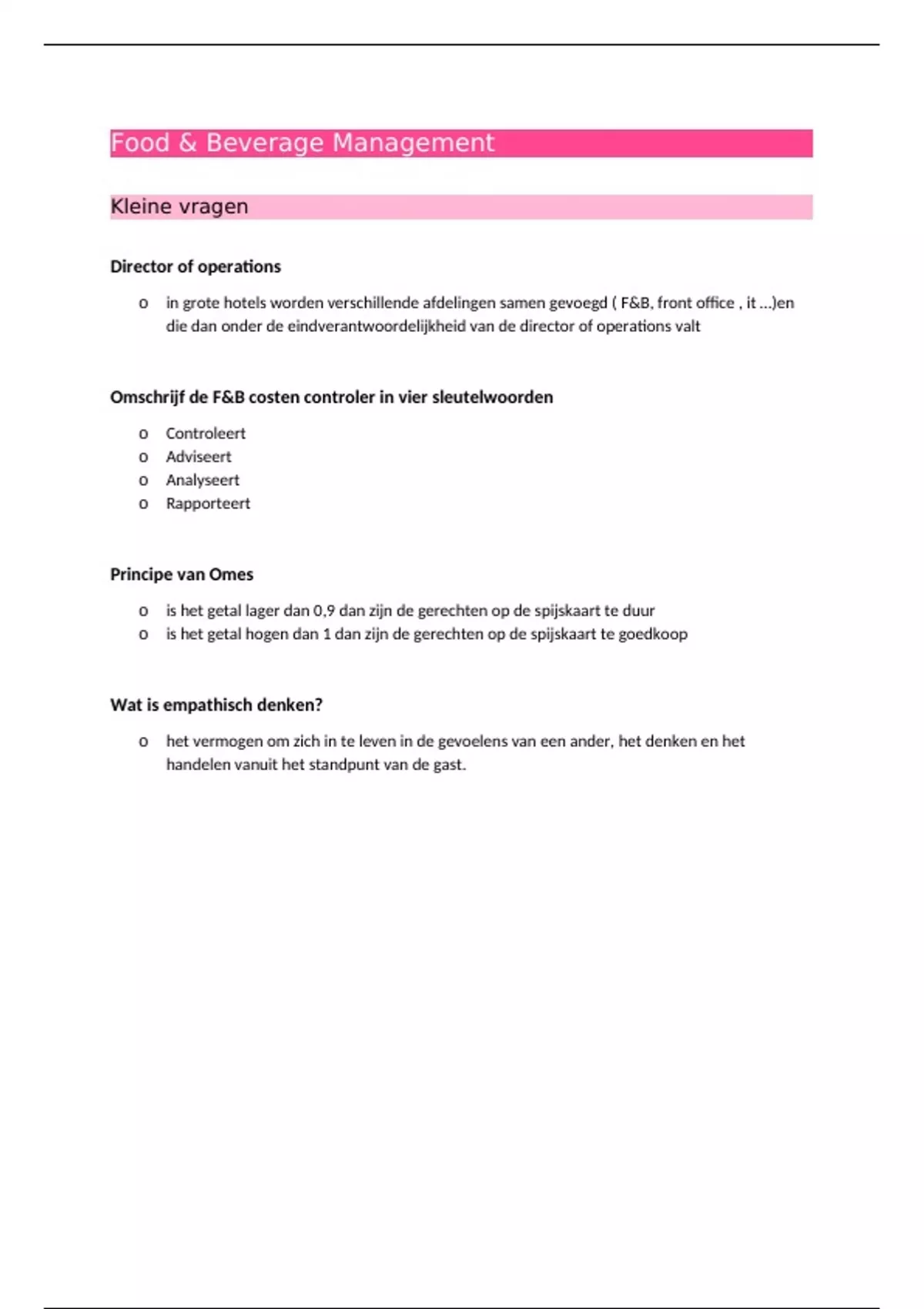 Samenvatting van 10 pagina's voor het vak F&B Management aan de Artesis
